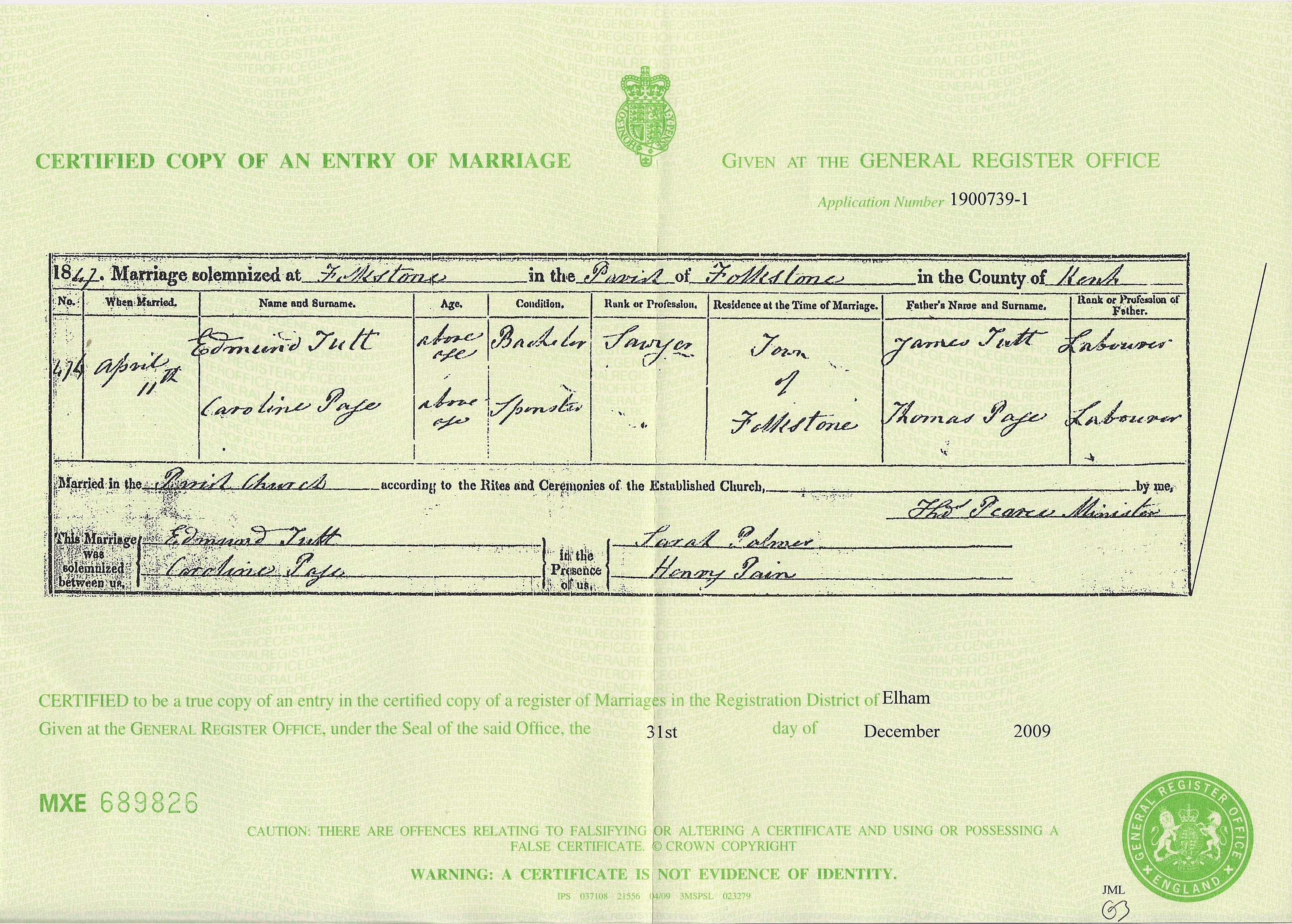 Edmund Tutt - Caroline Page - Marriage Certificate