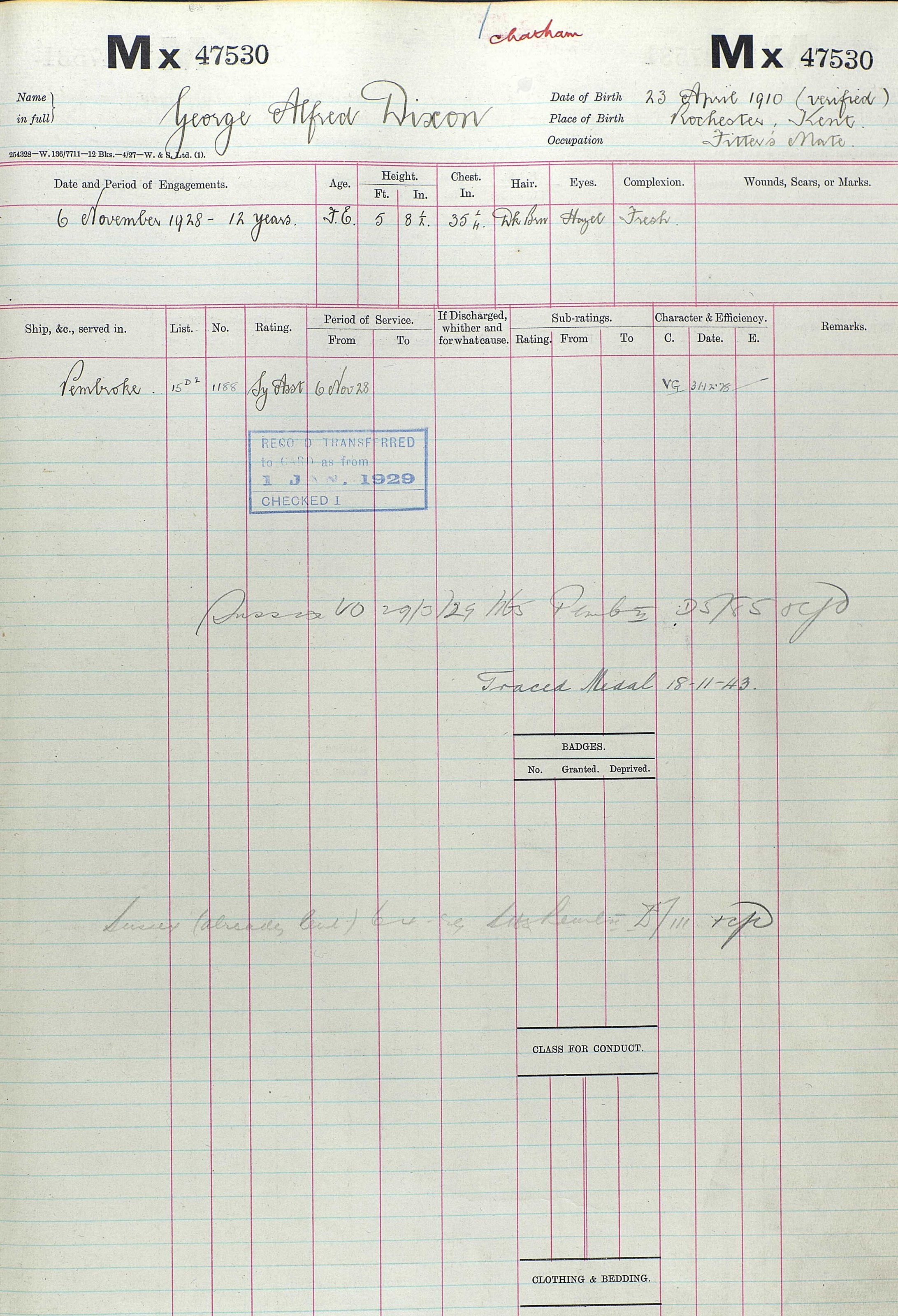 Throughout his life, he lived on 112 Cecil Road in Rochester on Apr 2, 19115; and on 50 Grove Road in Rochester on Sep 29, 19391. On Nov 6, 1928 he was serving in the navy (Royal Navy (HMS Pembroke) - Service Number MX 47530).