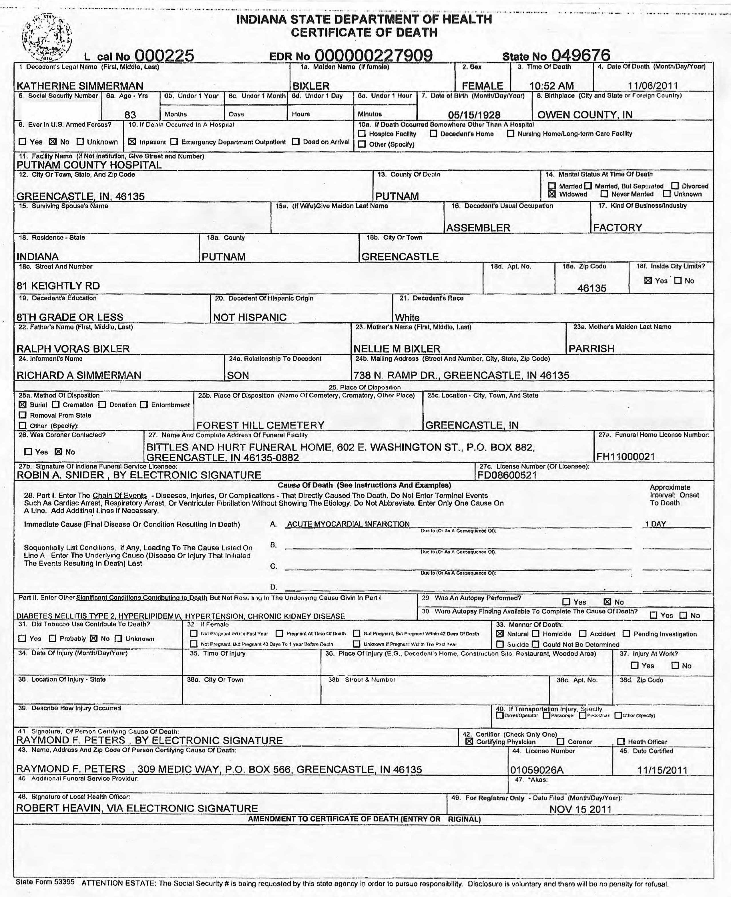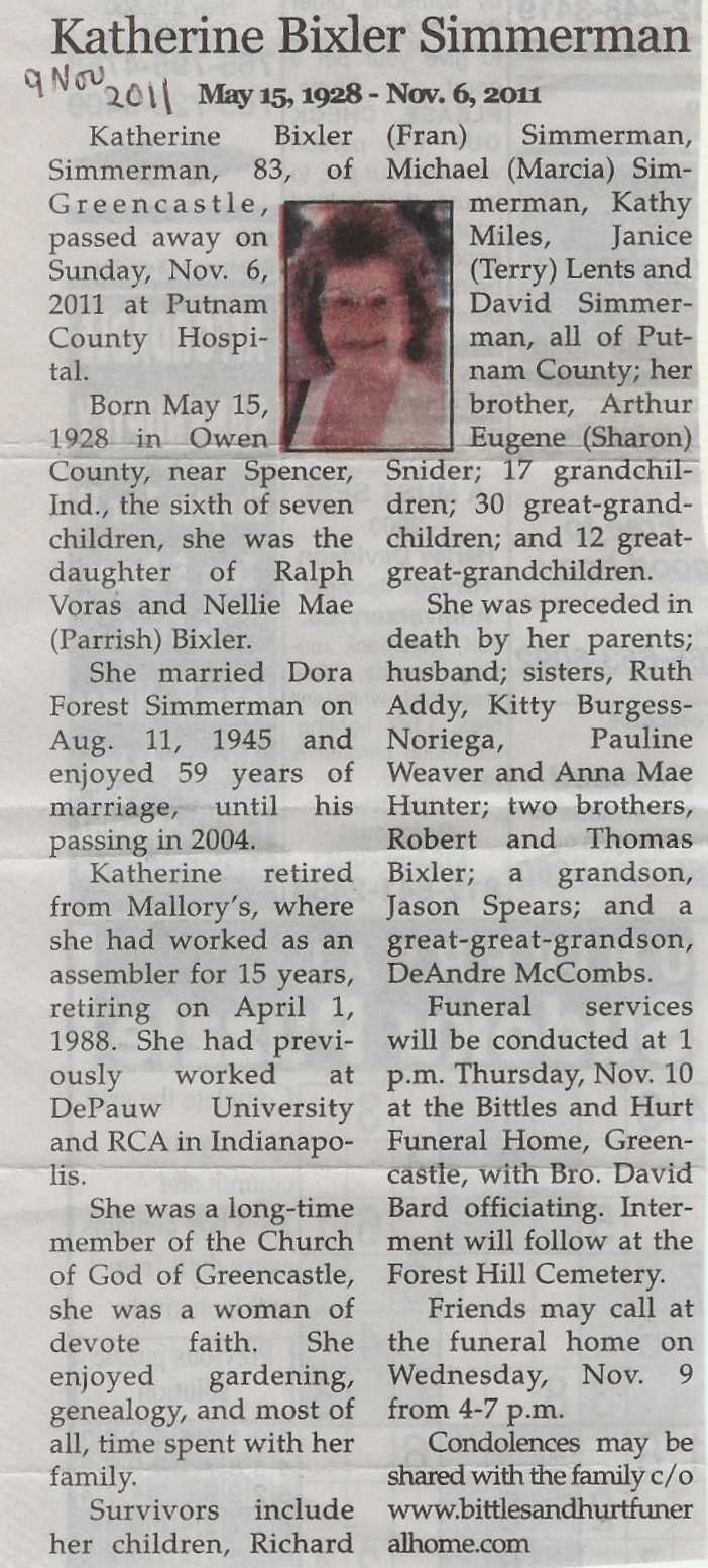 She died on Nov 6, 2011 at Putnam County Hospital, Greencastle, Putnam, Indiana (katherine Bixler Simmerman, age 83, of Greencastle, passed away on Sunday, Nov. 6, 2011 at Putnam County Hospital. Born May 15, 1928 in Owen County, near Spencer, Ind., the sixth of seven children, she was the daughter of Ralph Voras and Nellie Mae (Parrish) Bixler. She married Dora Forest Simmerman on Aug. 11, 1945 and enjoyed 59 years of marriage, until his passing in 2004. Katherine retired from Mallory's, where she had worked as an assembler for 15 years, retiring on April 1, 1988. She had previously worked at DePauw University and RCA in Indianapolis. She was a long-time member of the Church of God of Greencastle, she was a woman of devote faith. She enjoyed gardening, genealogy, and most of all, time spent with her family. Survivors include her children, Richard (Fran) Simmerman, Michael (Marcia) Simmerman, Kathy Miles, Janice (Terry) Lents and David Simmerman, all of Putnam County; her brother, Arthur Eugene (Sharon) Snider; 17 grandchildren; 30 great-grandchildren; and 12 great-great-grandchildren. She was preceded in death by her parents; husband; sisters, Ruth Addy, Kitty Burgess-Noriega, Pauline Weaver and Anna Mae Hunter; two brothers, Robert and Thomas Bixler; a grandson, Jason Spears; and a great-great-grandson, DeAndre McCombs. Funeral services will be conducted at 1 p.m. Thursday, Nov. 10 at the Bittles and Hurt Funeral Home, Greencastle, with Bro. David Bard officiating. Interment will follow at the Forest Hill Cemetery. Friends may call at the funeral home on Wednesday, Nov. 9 from 4-7 pm. Condolences may be shared with the family c/o www.bittlesandhurtfuneralhome.com) and was buried at Forest Hill Cemetery, Greencastle c. 2011.