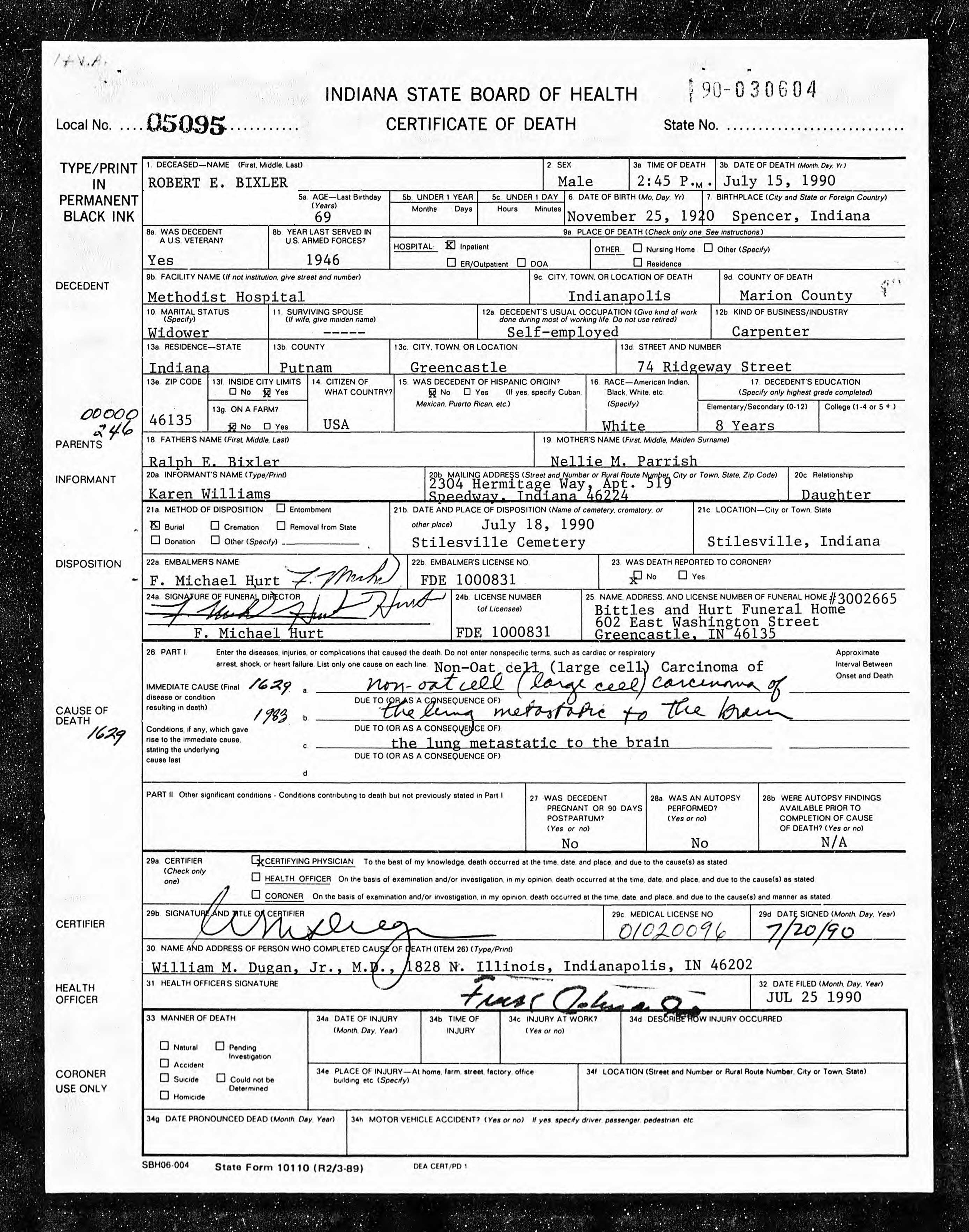 He died on Jul 15, 1990 at Methodist Hospital, Indianapolis, Marion, Indiana (non-oat cell (large cell) carcinoma of the lung metastatic to the brain) and was buried at Stilesville Cemetery, Stilesville, Hendricks, Indiana on Jul 18, 1990.