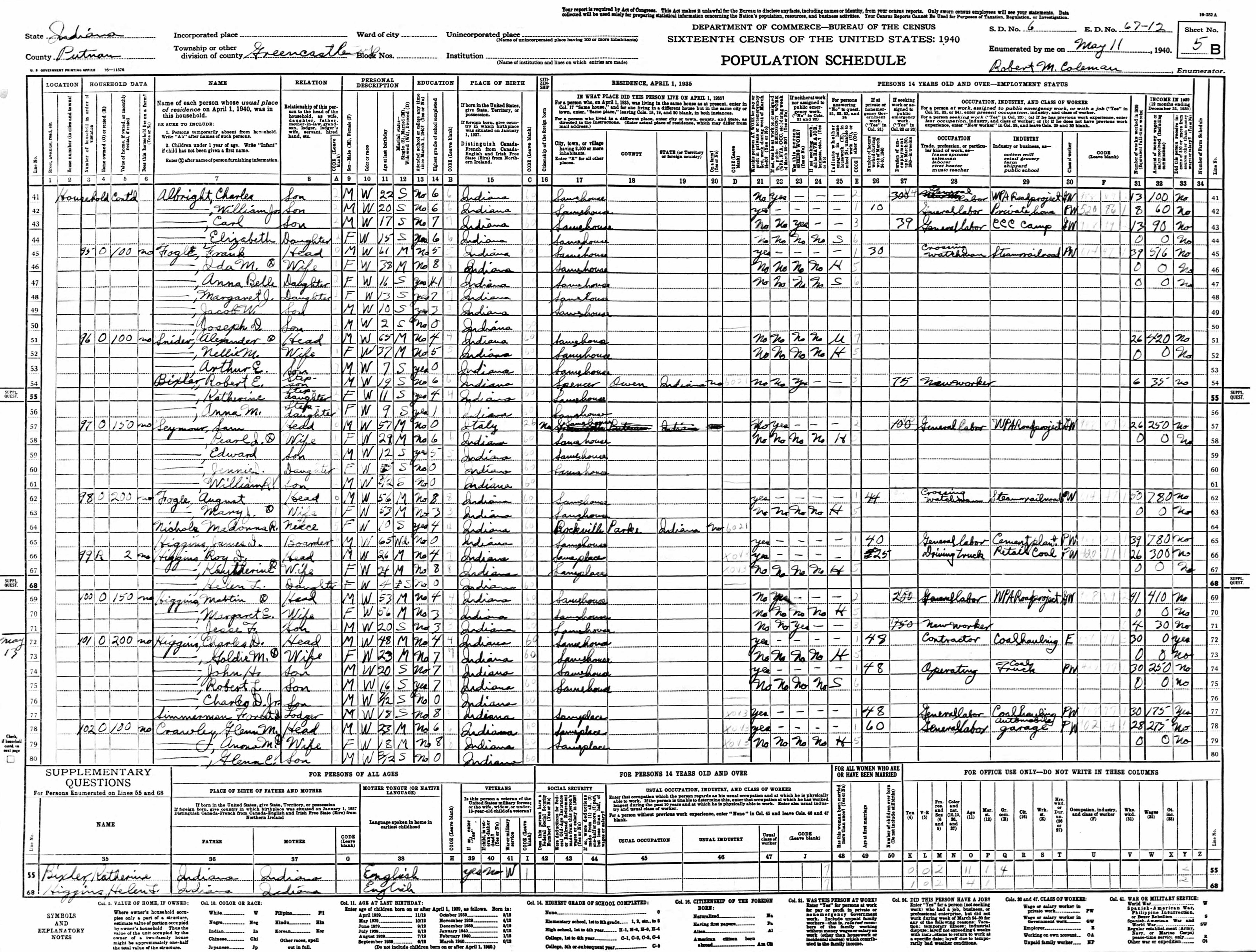Throughout his life, Robert lived in several places: on Joe Zink Road, Clay, Indiana on Apr 3, 19303; in Greencastle, Putnam, Indiana on May 11, 1940; and at 74 Ridgeway Street, Greencastle, Putnam, Indiana in 1990. He served in the military from Aug 21, 1942 to Jan 18, 1946 (amy - Warrant Officers; Rank: Private; Service number: 35505905 Enrolled 21 Aug 1942, released 18 Jan 1946).