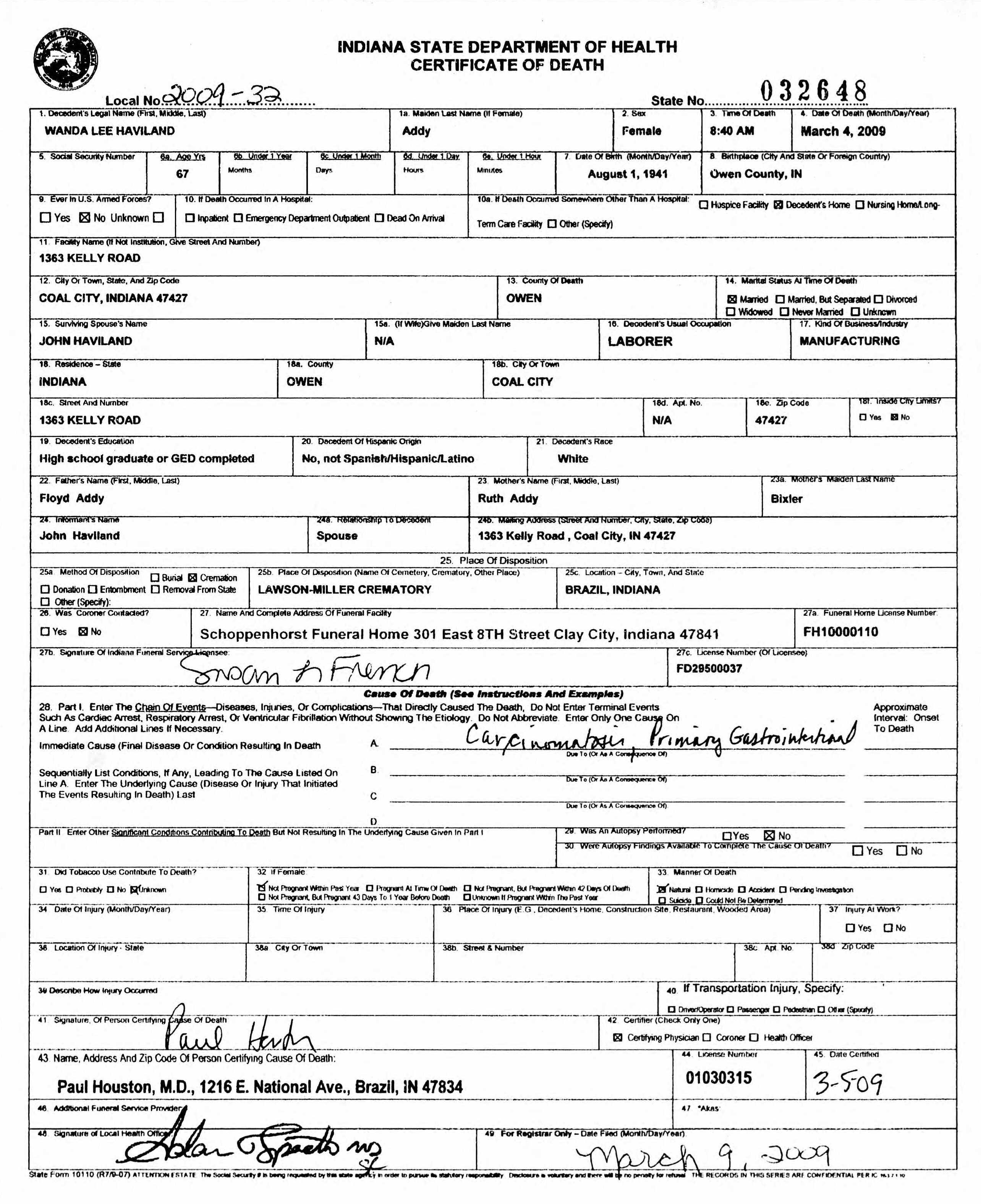 Throughout her life, she lived in Starke, Indiana, USA in 1957; and on 1363 Kelly Road, Coal, Indiana in 2009.