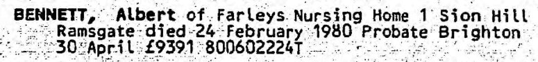 He died on Feb 24, 1980 at Farleys Nursing Home, 1 Sion Hill, Ramsgate, Kent2.