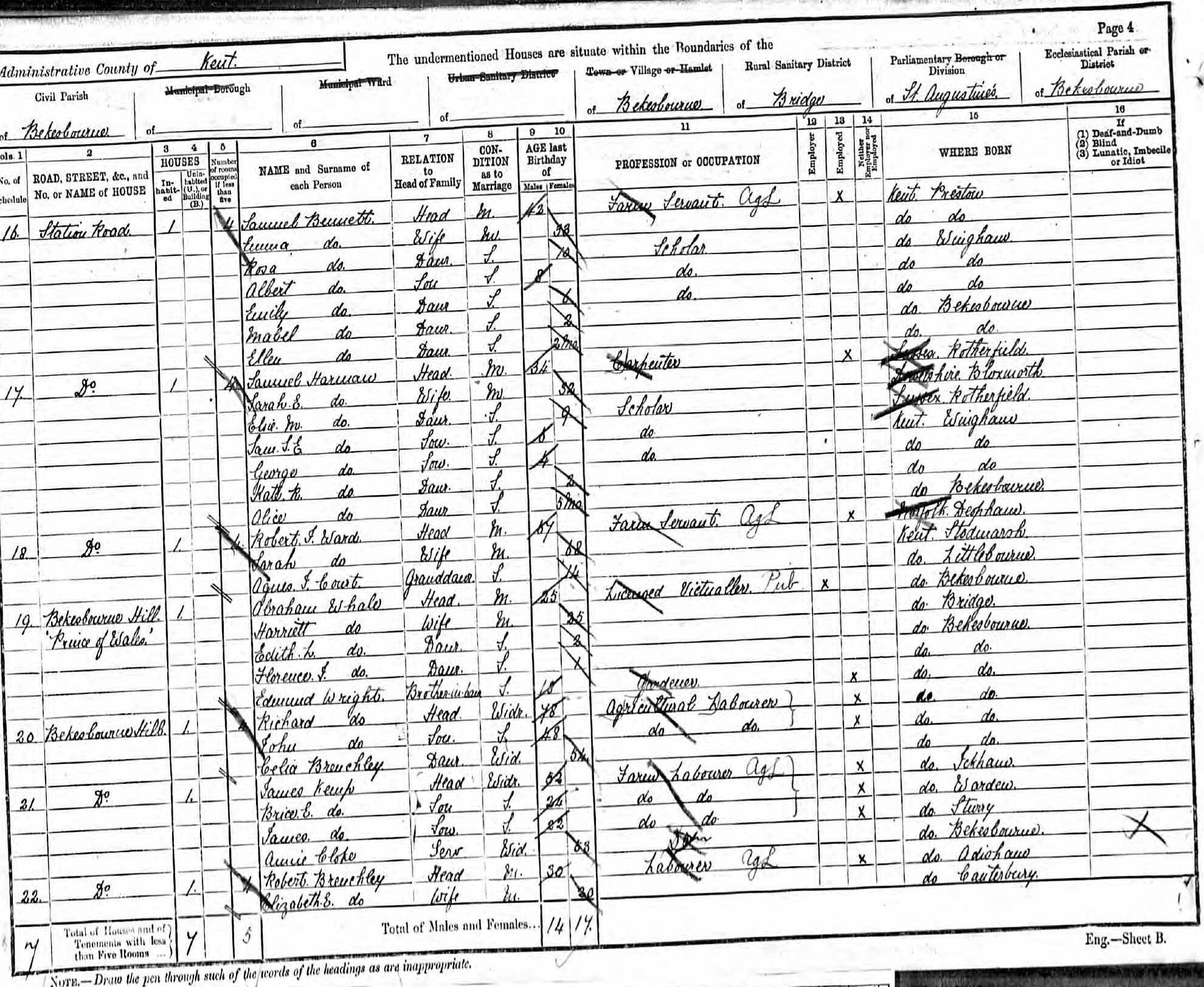 Throughout her life, Ellen lived in several places: on Station Road in Bekesbourne on Apr 5, 18912; at Netherton, Sibertswold, Kent, England on Mar 31, 19013; and at 2 Whittington Terrace in Sibertswold on Apr 2, 19114.
