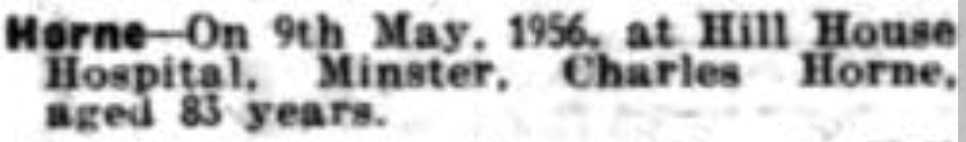 He died on May 9, 1956 on Hill House Hospital, Tothill Street, Minster in Thanet.