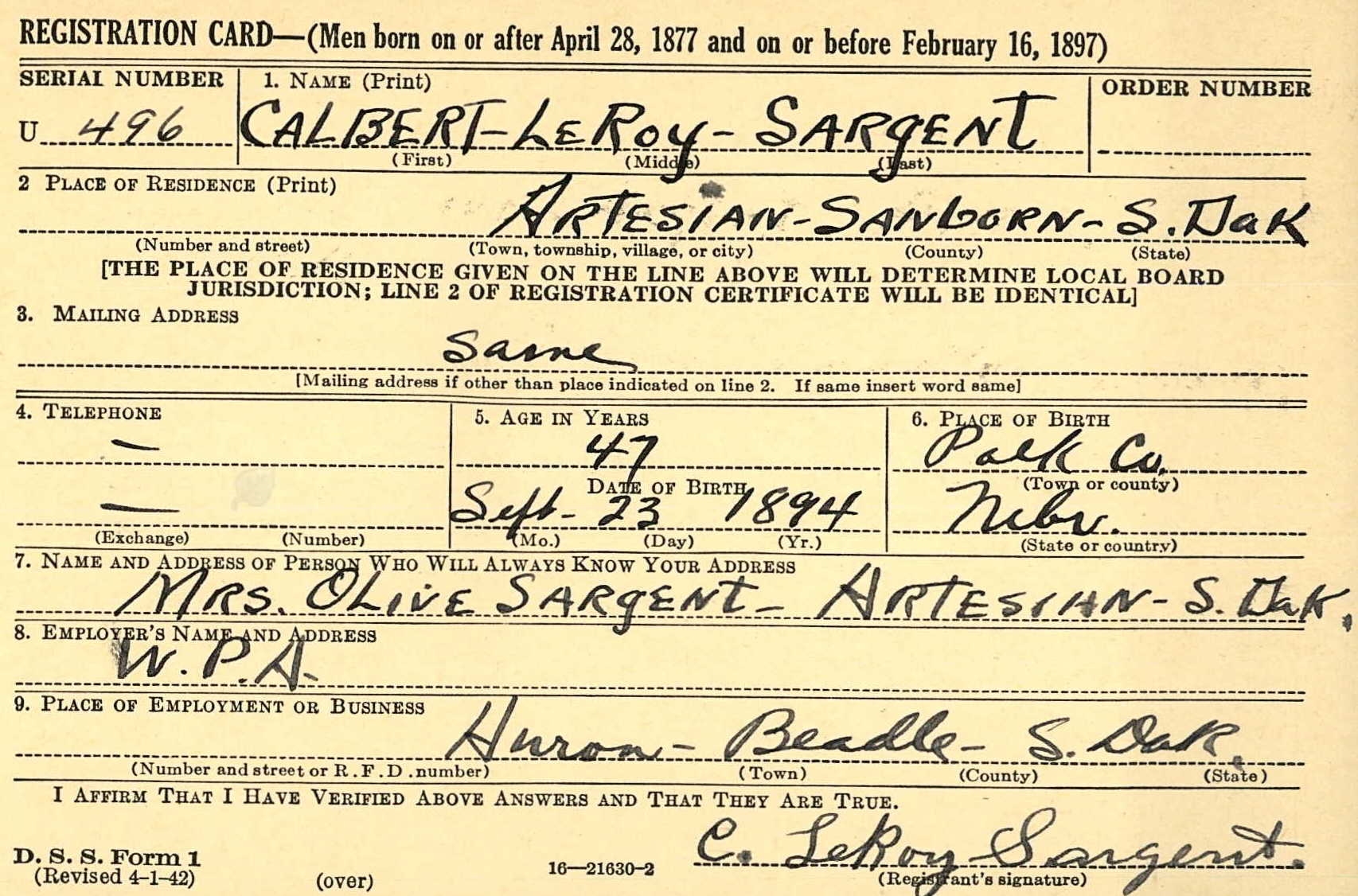 Throughout his life, Calbert lived in several places: in Osceola, Polk, Nebraska, USA on Apr 15, 19102; in Canada, Nebraska on Jan 6, 19206 (the same place as his father had been living in 1900); in Diana, Sanborn, South Dakota, USA in 1935; in Artesian, South Dakota on Apr 27, 1942; and in Huron, Beadle, South Dakota in 1971. He served in the military from 1917 to 1918 (world War I Draft Registration Cards).