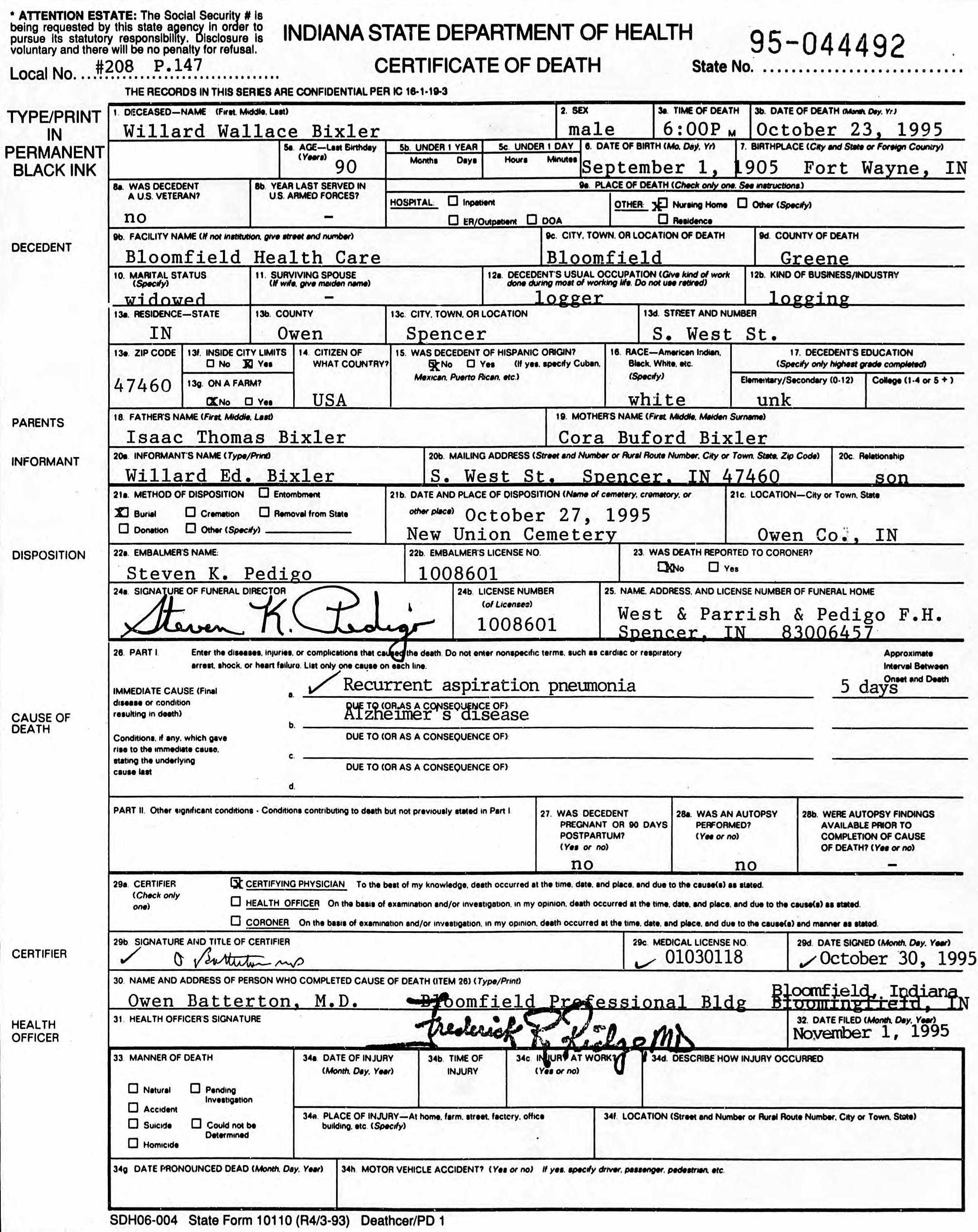 He died on Oct 23, 1995 at Bloomfield Health Care, Bloomfield, Greene, Indiana1,2 (pneumonia) and was buried at New Union Cemetery, Spencer, Owen, Indiana on Oct 27, 19954.