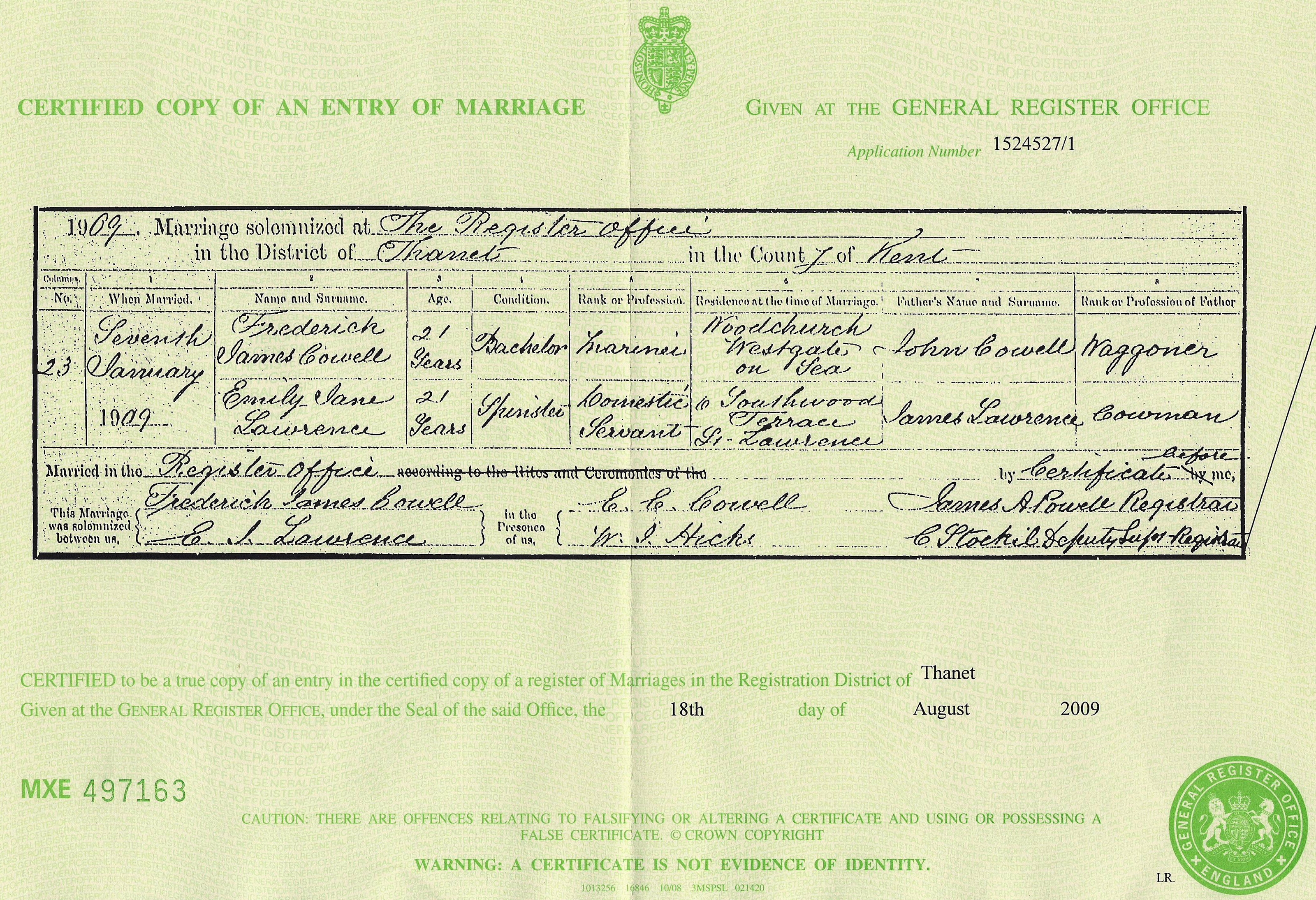James Cowell - Emily Lawrence - marriage certificate