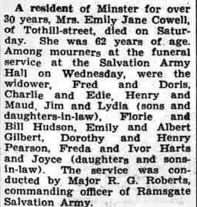 She died on Aug 19, 1950 Minster in Thanet7,8,9 and was buried there at Minster Cemetery, Tothill St on Aug 23, 1950 following her funeral at The Salvation Army Hall, 11 Tothill St7.