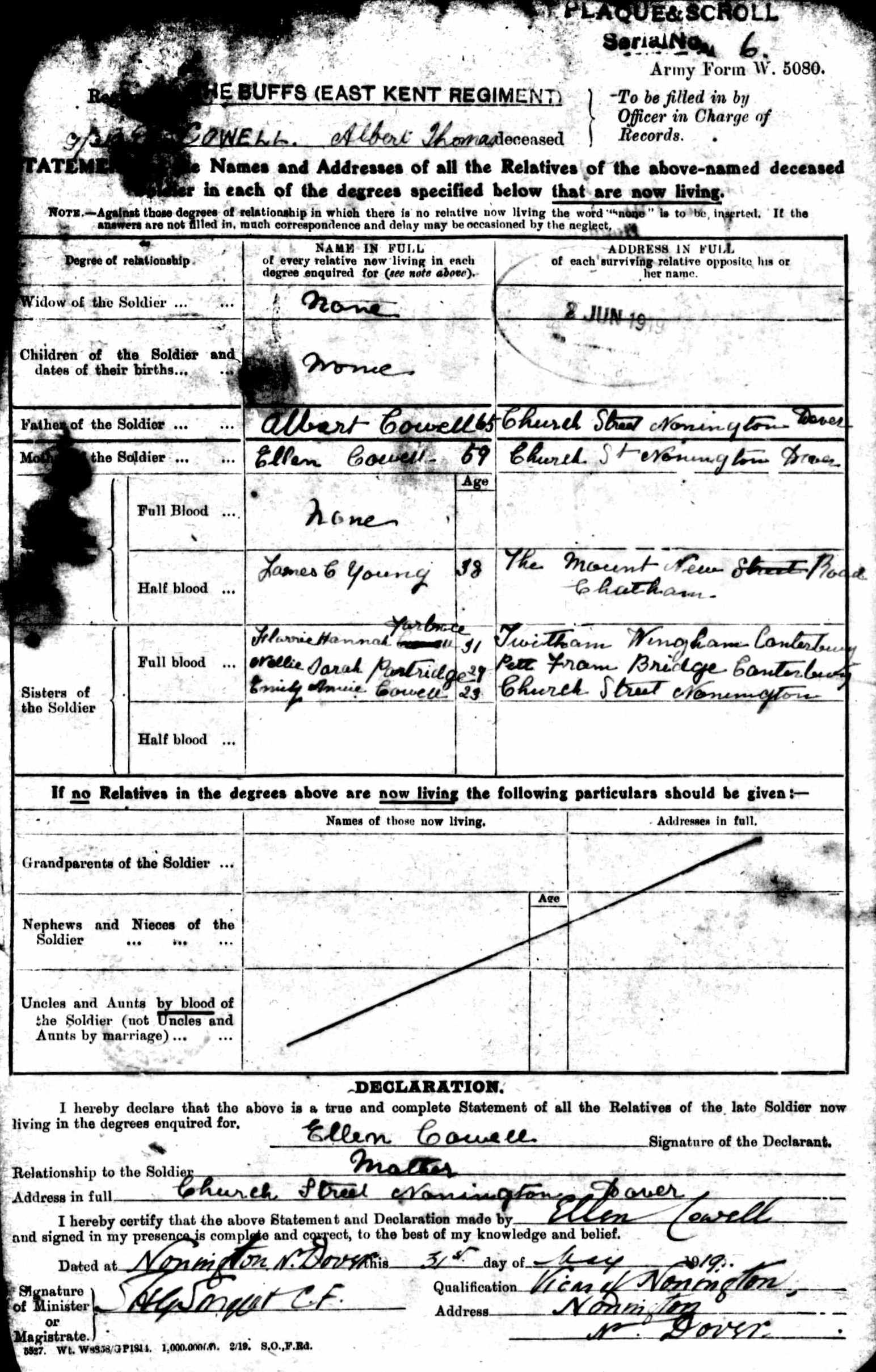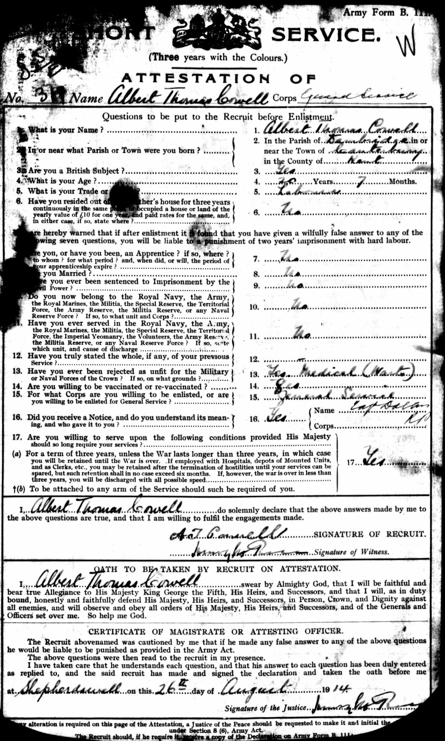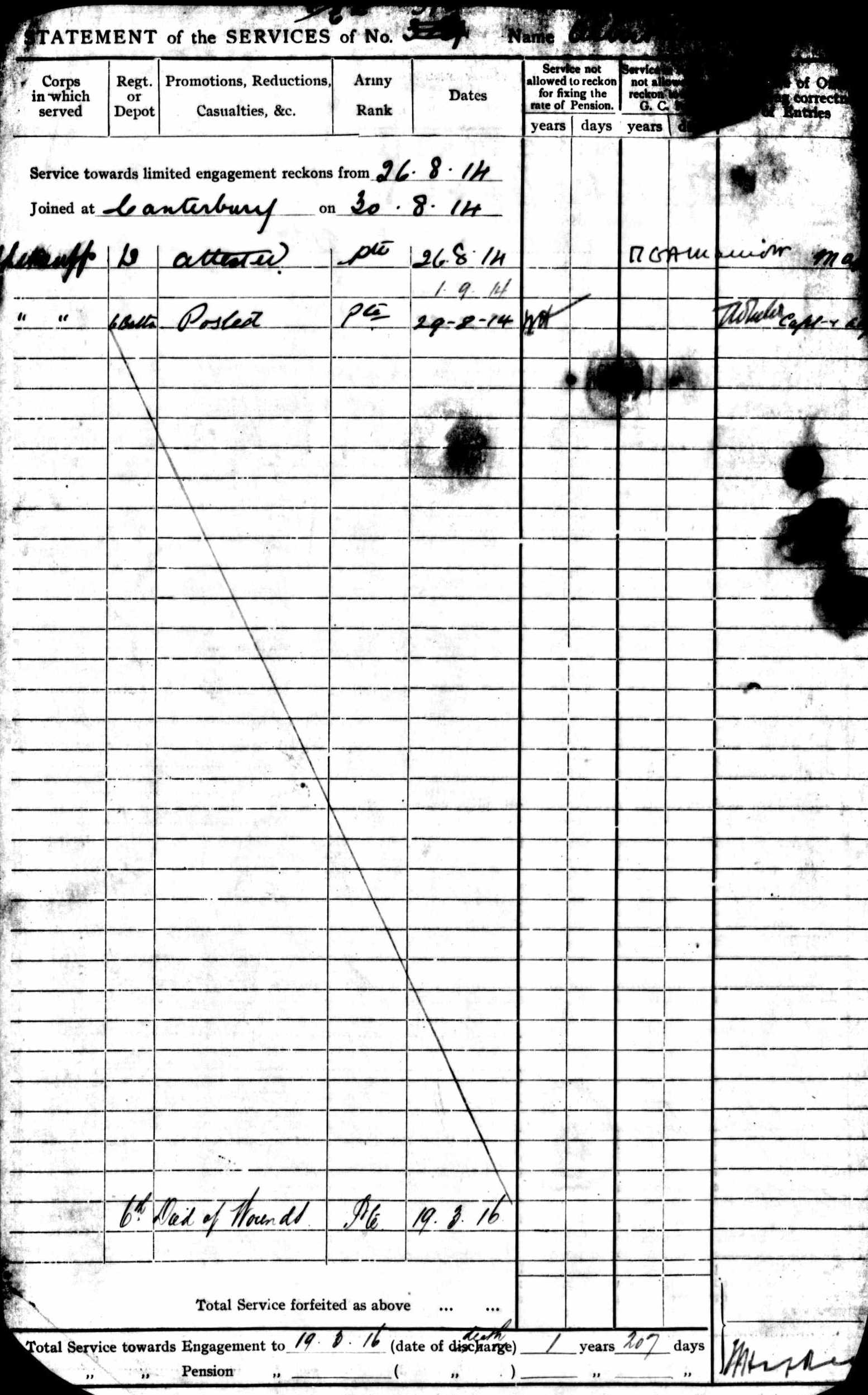 Throughout his life, he lived at Adisham Street, Adisham, Kent, England on Mar 31, 19014; and at Church Street, Nonington, Kent on Apr 2, 19115. He served in the army from Aug 26, 1914 to Mar 19, 1916 (regiment: Buffs (East Kent Regiment); Service number: GS/EK/319).