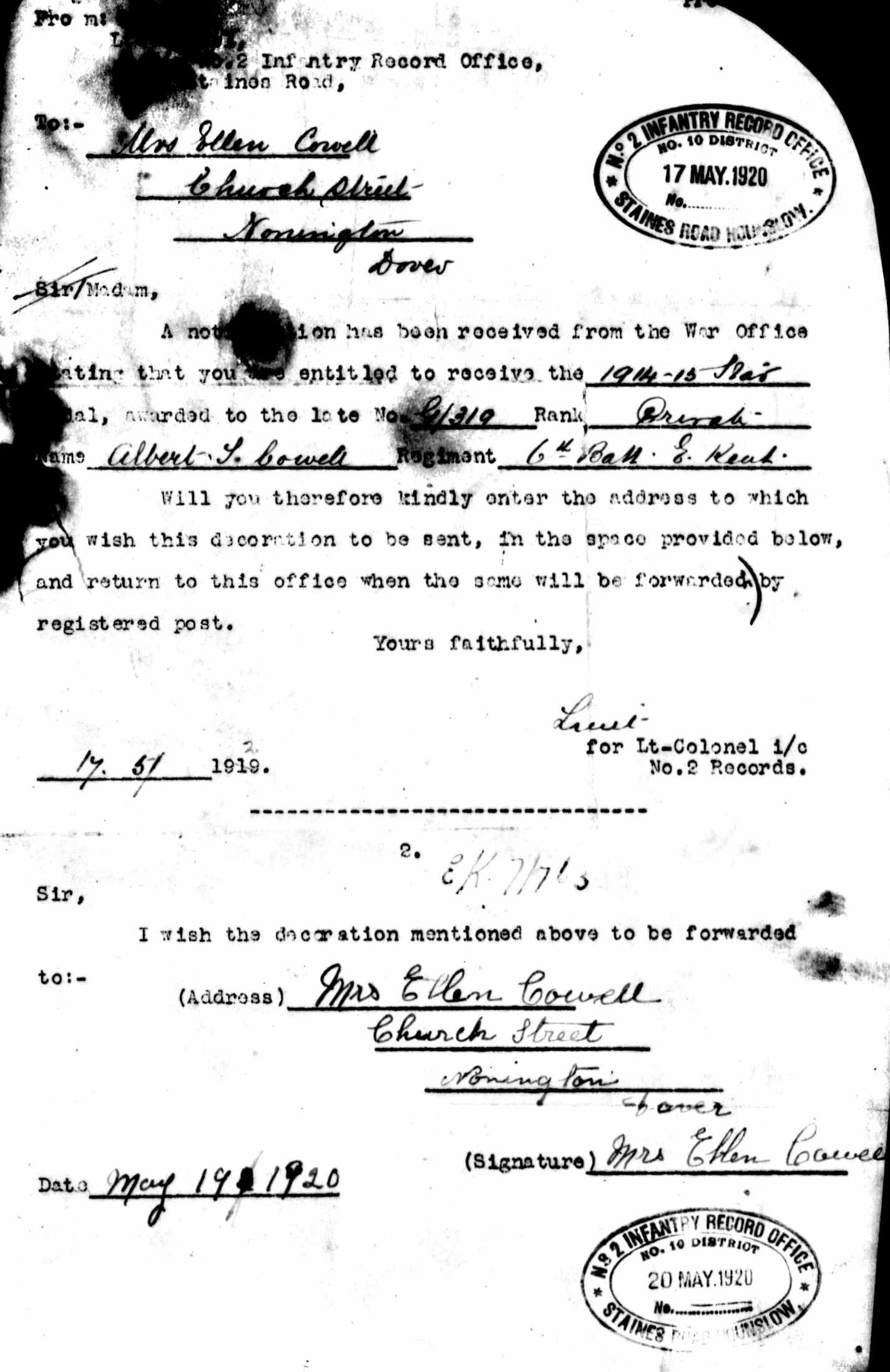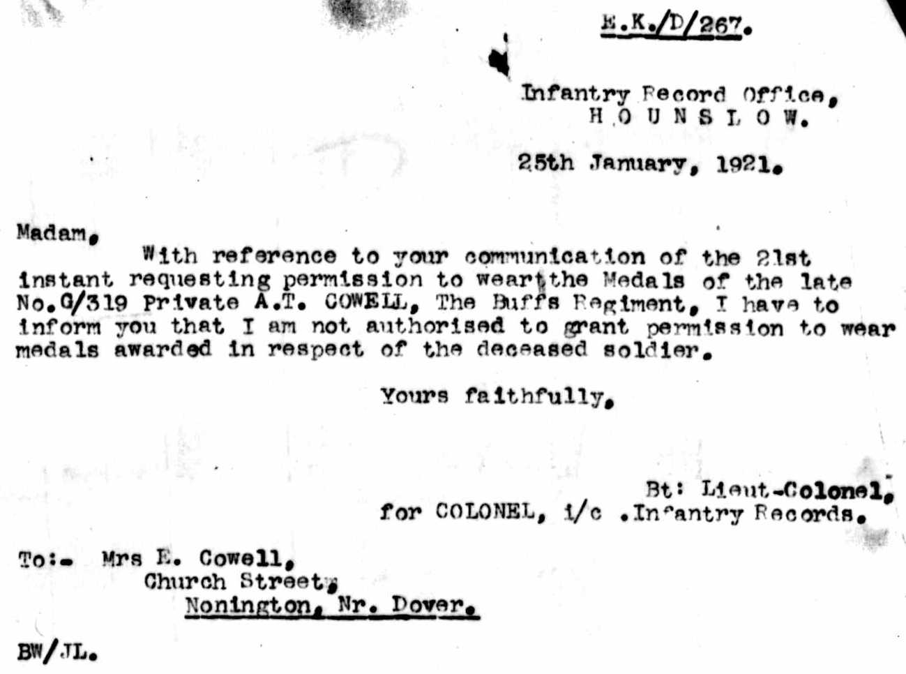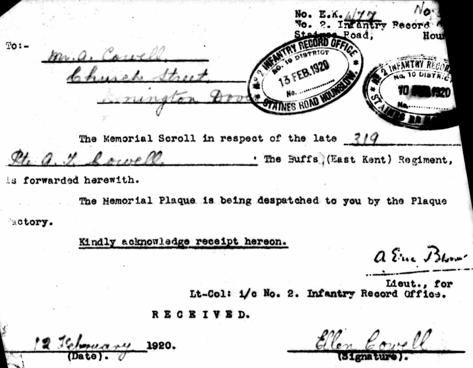 Throughout his life, he lived at Adisham Street, Adisham, Kent, England on Mar 31, 19014; and at Church Street, Nonington, Kent on Apr 2, 19115. He served in the army from Aug 26, 1914 to Mar 19, 1916 (regiment: Buffs (East Kent Regiment); Service number: GS/EK/319).