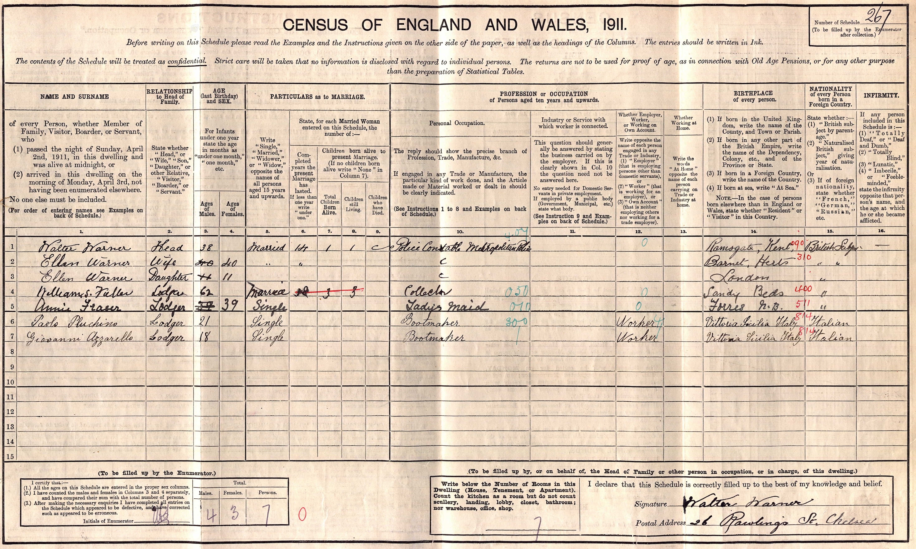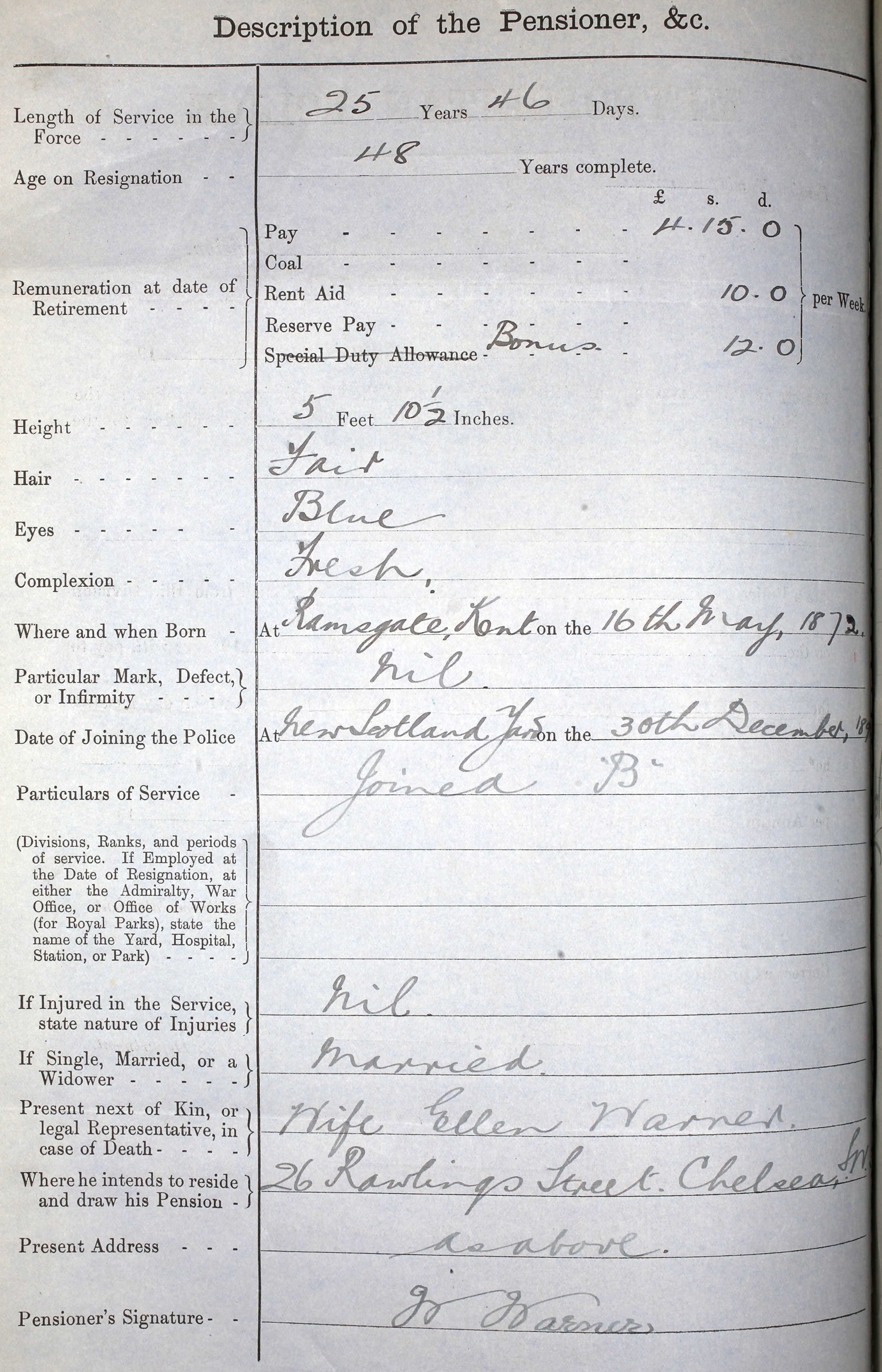 [ Home ] | [ Calendar ] | [ Surnames Index ] | [ Family History ]A constable in the metropolitan police officer and the son of William Warner (a builder's laborer) and Sarah Chapman,