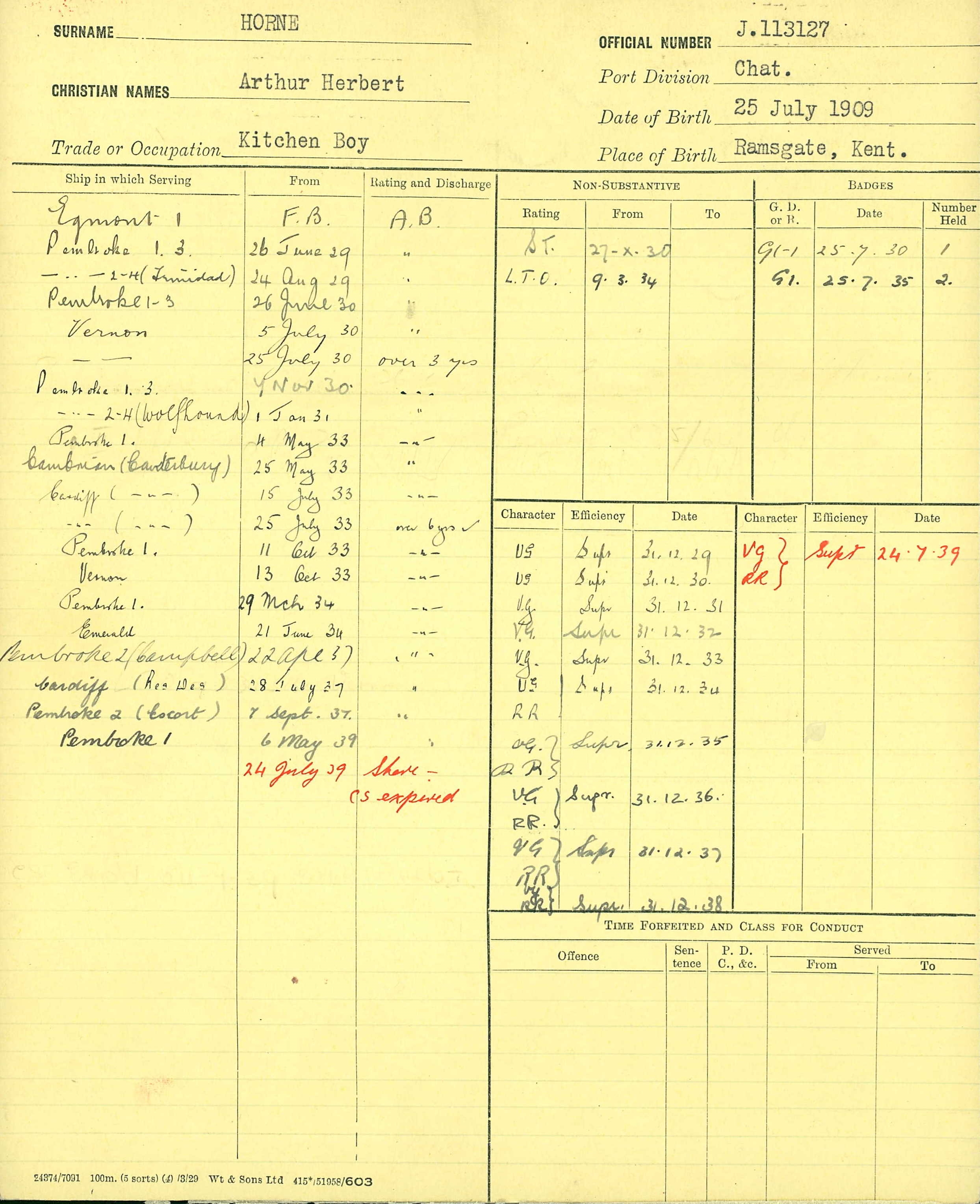Throughout his life, Arthur lived in several places: on 30 Royal Road in Ramsgate on Apr 2, 19111; on 12 King Edward Road in Ramsgate on Jun 19, 192112; on 47 St Patricks Road in Ramsgate on Sep 29, 19392; and on 41 Vale Road in Ramsgate in 19539, in 19558, in 196310, in 19657, in 197411 and in 1984. He served in the navy from Jun 26, 1929 to 1939.
