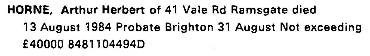 Arthur Horne, the second cousin twice-removed on the father's side of Nigel Horne, was born in Ramsgate, Kent, England on Jul 25, 19091,2, was baptized there at Christ Church on Aug 15, 1909 and also married Lily Marley (with whom he had 6 children: Arthur Richard, David Edward, Richard John, Dorothy E, John and Marion Rose, along with 4 surviving children) there at Holy Trinity Church, on Dec 26, 19326.