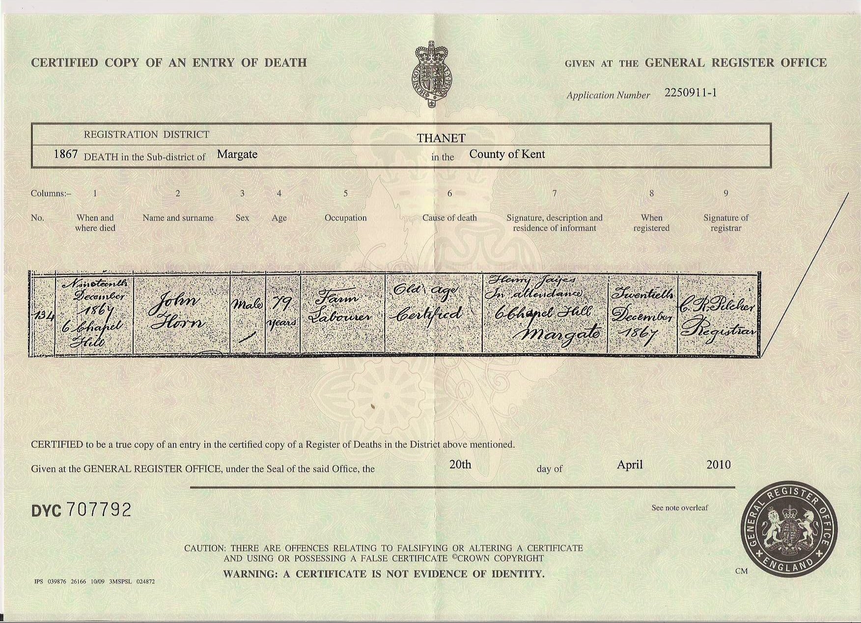 John Horn - death certificate