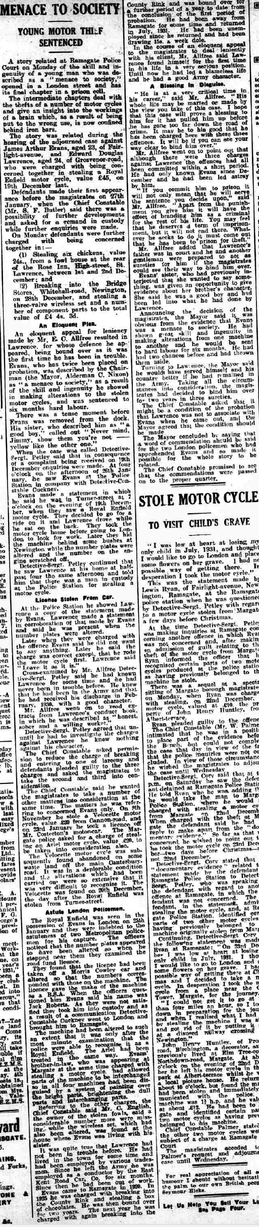 The Chief Constable said he wanted the magistrates to take a number of other matters into consideration at the same time. The matters he was referring to concerned Evans only. On 9th November he stole a Velocette motor cycle, value £30 fromCannon-road. and on 23rd January he took a license off Mr. Costerton's motorcar. The Margate police asked for a charge of stealing an Ariel motorcycle value £30 to be taken into consideration also.
