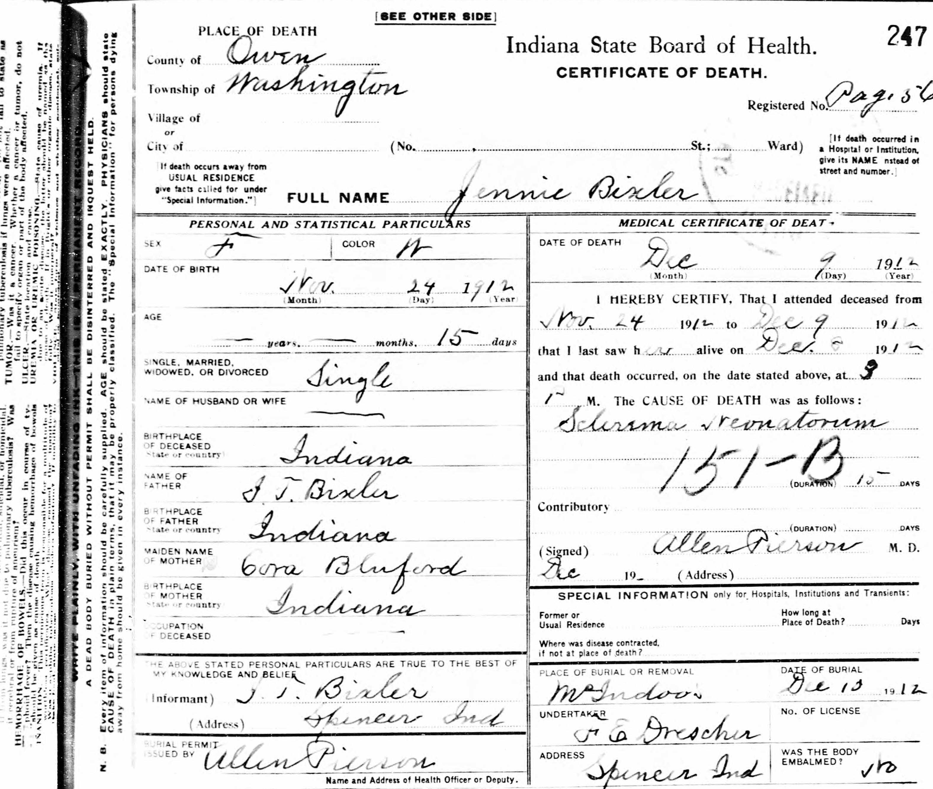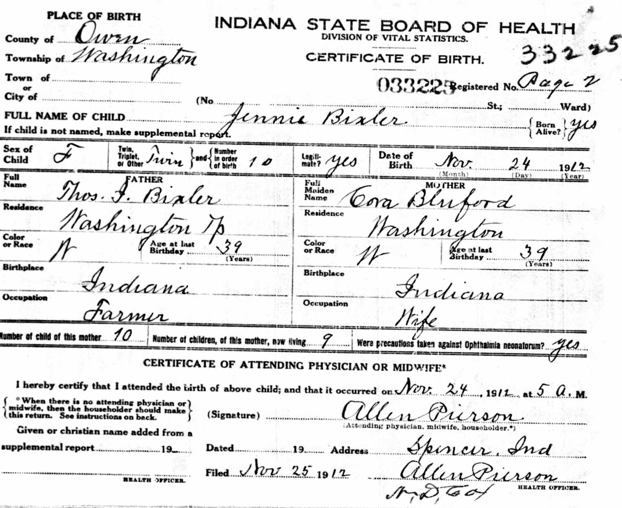 Jennie Bixler, the fourth cousin twice-removed on the mother's side of Nigel Horne, was born in Washington, Owen, Indiana, USA on Nov 24, 1912.