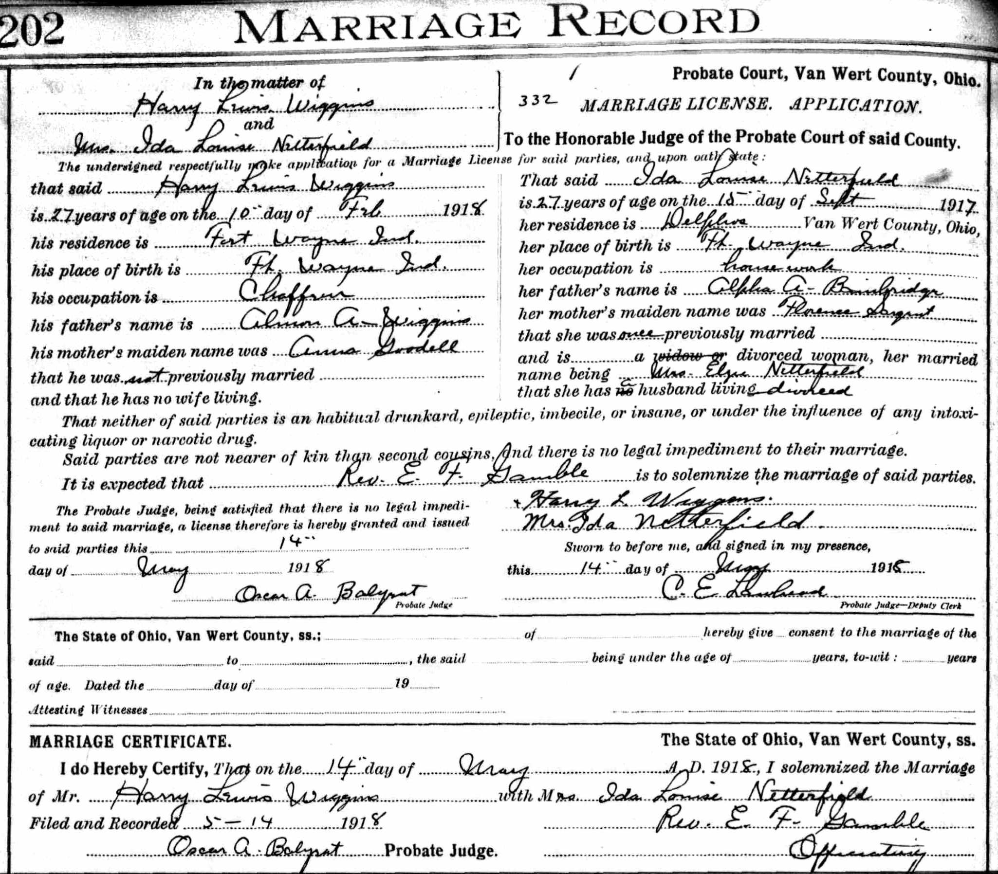 Harry Wiggins, the husband of Ida Louise Bainbridge (the third cousin three-times-removed on the mother's side of Nigel Horne), was born in Fort Wayne, Allen, Indiana, USA on Feb 10, 18911. He married Ida in Van Wert, Ohio, USA on May 14, 19181.