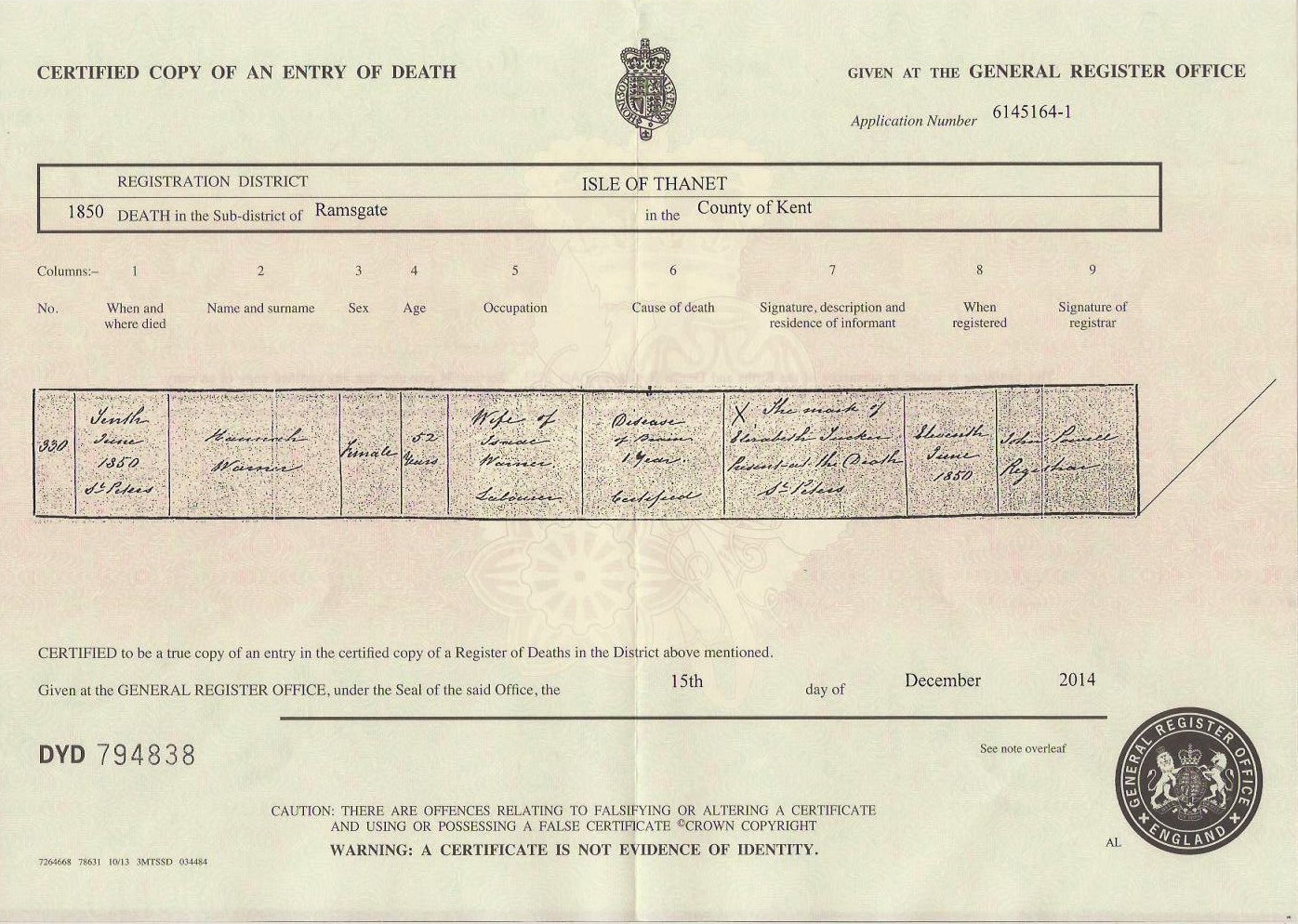 She died on Jun 10, 1850 in St Peters, Thanet, Kent3,4 and was buried there on Jun 16, 1850 (Age 52 at burial; KFHS CD29)6.