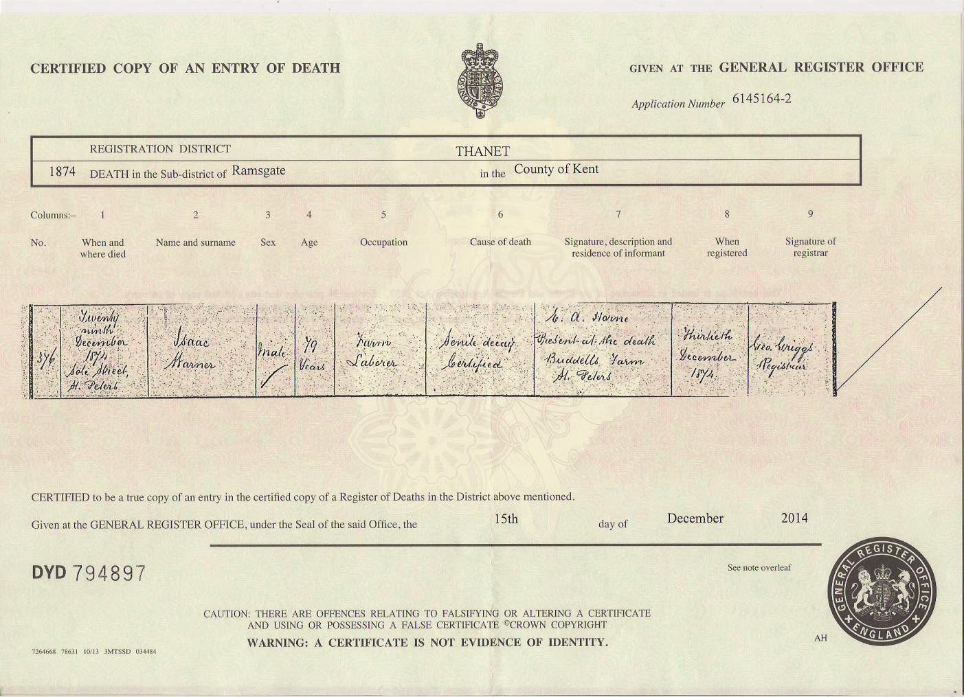 Isaac spent all of his life in Kent, England. Throughout his life, he lived in several places around the county: at Callis Court, St Peters, Thanet, Kent, England on Jun 6, 18418; on Tippledore Lane, St Peters in Thanet on Mar 30, 18519 following the death of his wife on Jun 10, 1850; at Serene Place, Broadstairs on Apr 7, 186111; and at 1 Serene Place, Broadstairs on Apr 2, 187110.