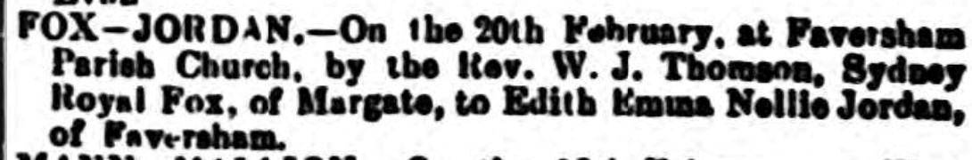 Edith Jordan, the second cousin twice-removed on the mother's side of Nigel Horne, was born in Faversham, Kent, England c. Nov 18851,2, was baptized there at St Mary of Charity Church, Church Road on Nov 27, 1885. She also married Sydney Fox (with whom she had 1 surviving child) there at St Mary of Charity Church, Church Road, on Feb 20, 19094.