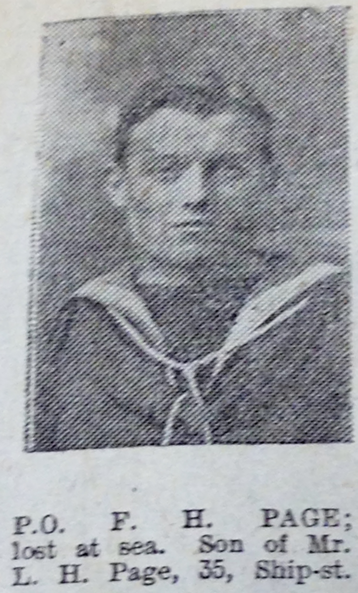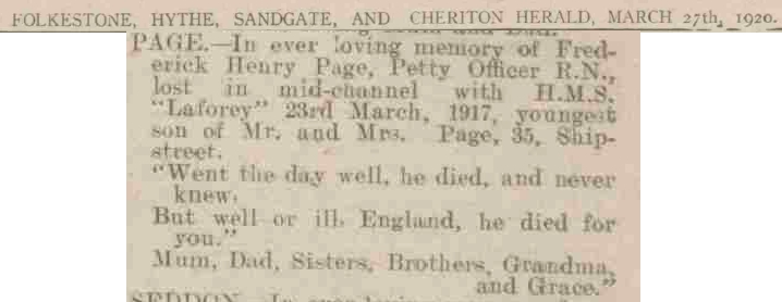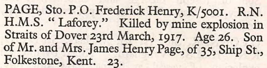Frederick Page, the third cousin once-removed on the father's side of Nigel Horne, was born in Folkestone, Kent, England on Mar 26, 18911,2,3 and baptized there at St John The Baptist on Jun 14, 1891. He was married to Unknown. On Apr 2, 1911, he lived at Sailors Home, Dover, Kent, England7. During 1917, he was serving in the navy (regiment: Royal Navy; Rank: Petty Officer Stoker; Service number: K/5001; HMS Laforey).