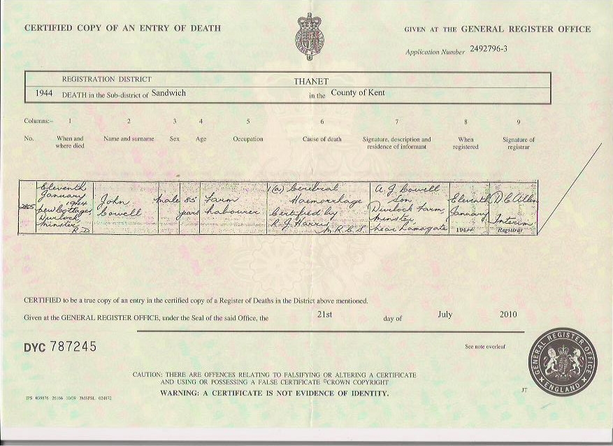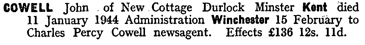 He died on Jan 11, 1944 at New Cottages, Durlock, Minster, Thanet, Kent8,9 (cerebral hemorrhage) (unmarked grave in Minster Cemetery. Value of estate £136:12:11).
