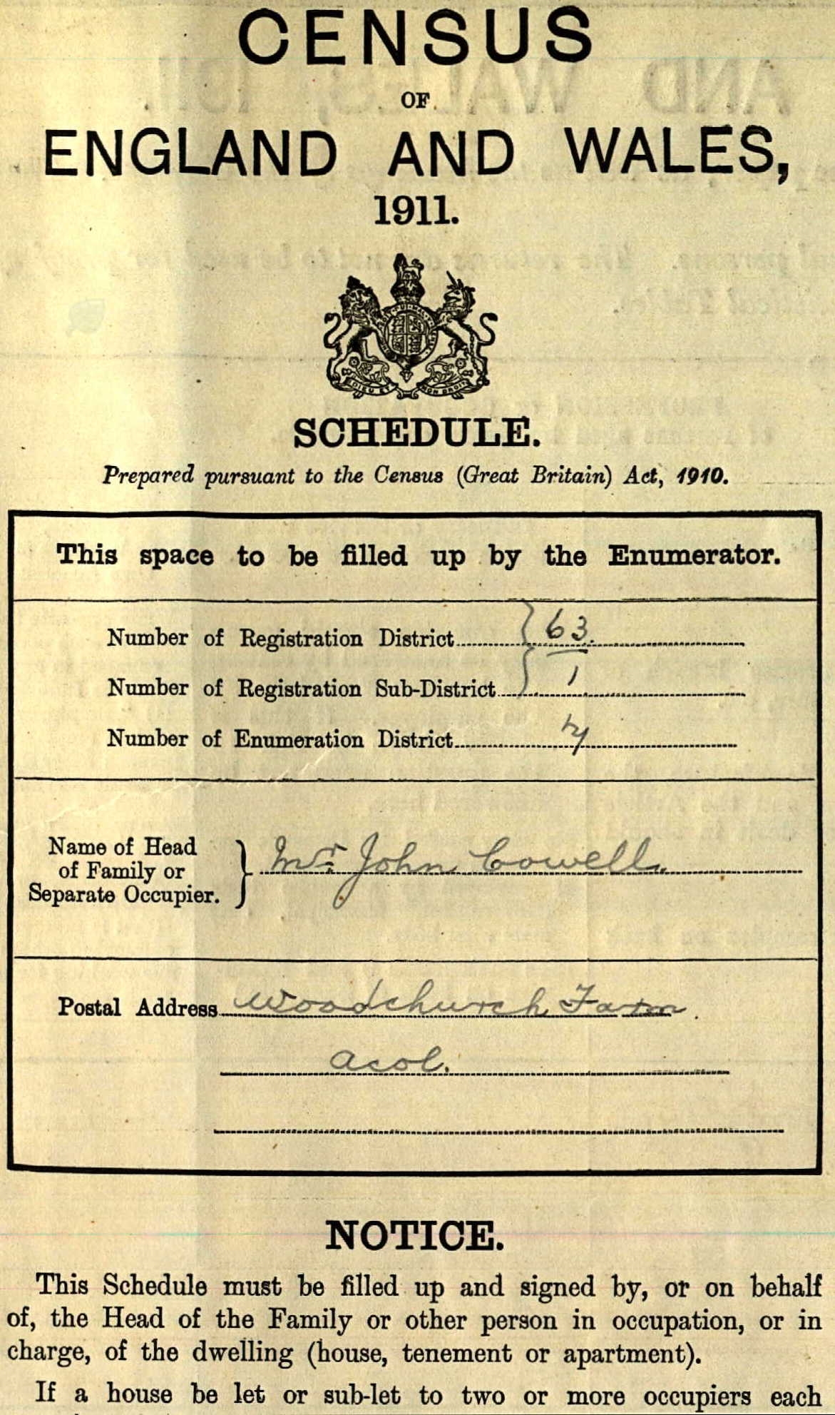 - 1911 England Census Online publication - Provo, UT, USA: Ancestry.com Operations, Inc., 2011.Original data - Census Returns of England and Wales, 1911. Kew, Surrey, England: The National Archives of the UK (TNA), 1911. Data imaged from the National Archives, London, England.