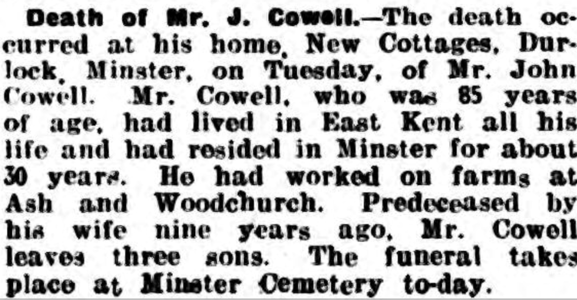 John spent all of his life in Kent, England. Throughout his life, he lived in several places around the county: at Stodmarsh Street, Stodmarsh on Apr 7, 186116; at Nethergone, Chislet on Apr 2, 187113; at Wayborough, Minster, Thanet on Apr 3, 188112; in Upstreet on Apr 5, 189111 following the death of his wife on May 7, 1889; at 2 Woodchurch Farm Cottages, Acol on Mar 31, 190117; at Woodchurch Farm, Acol on Apr 2, 191114 (when he was living with his parents); at Sandhills, Ash on Jun 19, 192118; and at 7 Pouces Cottages, Manston on Sep 29, 193915. John In 1921 he was working at Mr Quested (Farmer) at Goldstone, Ash, Kent, England.