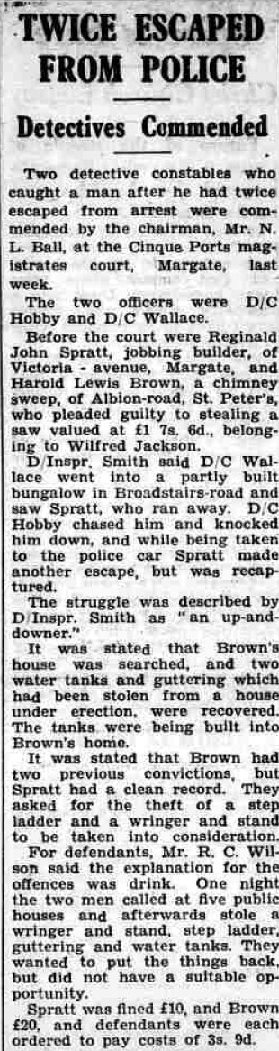 Reginald was apprenticed at the age of 14 to the splendidly named Isle of Thanet Gas Light and Coke Co Ltd. He became a qualified gas fitter and after work in the aircraft industry during the war as a riveter, he set up up a business in 1946 with his brother in law and another guy, trading as North Foreland Builders. The business collapsed because in those days building permits were required due to shortage of materials, but a customer who claimed to have the necessary permission lied and then refused to pay their bill. In later years he worked as a plumber (similar to gas fitting) for the Thanet Council.