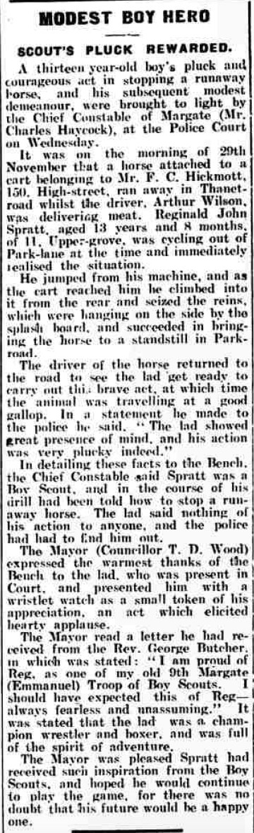 Reginald Spratt, the first cousin once-removed on the father's side of Nigel Horne, was born in Thanet, Kent, England on Apr 17, 19111,2,3,4,5 and. He married Charlotte Neilson (with whom he had 2 surviving children Robert E J and Joan F) in Thanet around Feb 19347.