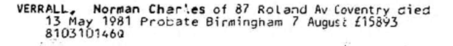 Norman Verrall, the first cousin once-removed on the father's side of Nigel Horne, was born in Thanet, Kent, England on Mar 15, 19261,2,3. He married Ena Bailes in Cannock, Staffordshire, England around Aug 19495. In 1981, he lived at 87 Roland Avenue, Coventry, Warwickshire, England.
