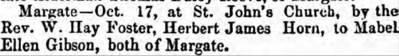 [ Home ] | [ Calendar ] | [ Surnames Index ] | [ Family History ]Mabel Gibson, the wife of Herbert James Horn (the first cousin three-times-removed on the father's side of Nigel Horne), was born in Chartham, Kent, England on Jan 15, 18731,2,3,4,5 and married Herbert (a carter with whom she had 9 children: William, Florence, John Edwin Ernest, Mabel Ellen Frances, Herbert James Frederick, Kathleen Charlotte, Charles, James and George Francis, along with 1 surviving child) at St John The Baptist's Church, Margate, Kent, England on Oct 17, 18917.