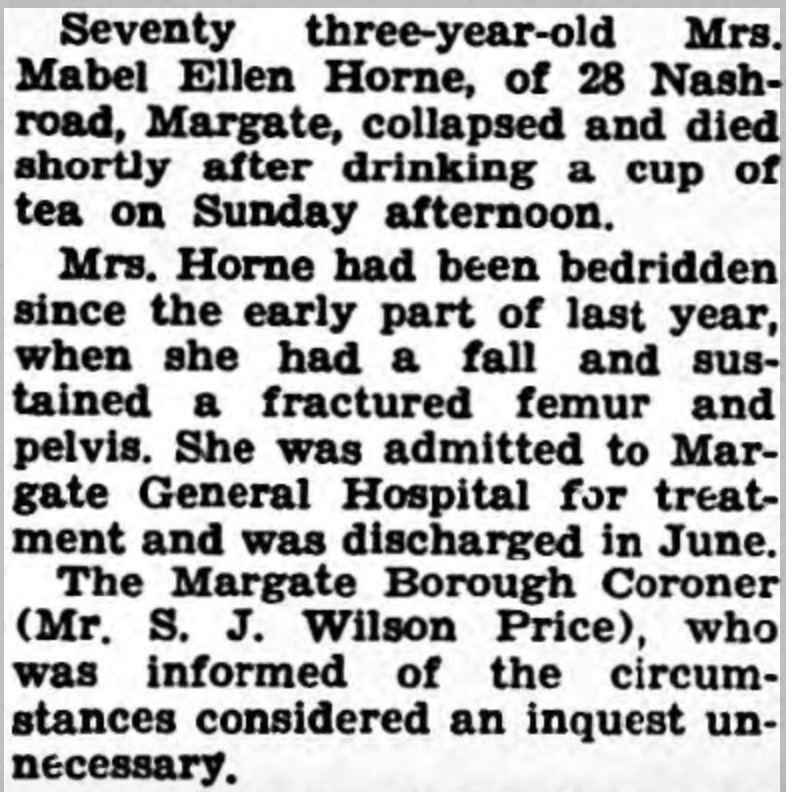 Mabel spent all of her life in Kent, England. Throughout her life, she lived in several places around the county: at Shalmsford Street in Chartham on Apr 3, 18811; on 6 Grange Road in Margate on Mar 31, 19012; on 84 Byron Road in Margate on Apr 2, 19113; on 109 Nash Road in Margate on Sep 29, 19394; and on 28 Nash Road in Margate in 1947.