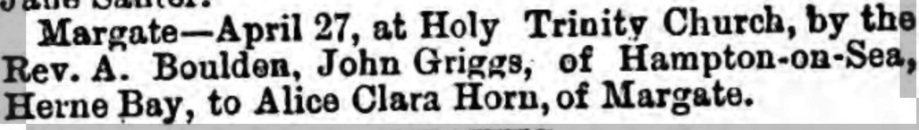 John Griggs, the husband of Alice Clara Horn (the first cousin three-times-removed on the father's side of Nigel Horne), was born in Herne Bay, Kent, England in 18681 and married Alice (with whom he had 8 children: William James, Florence May, Alice Maud Mary, Charles Walter, Winifred Doris, Helen Maud, Mary Ann and Mildred Sylvia) at Holy Trinity Church, Margate, Kent, England on Apr 27, 18902.