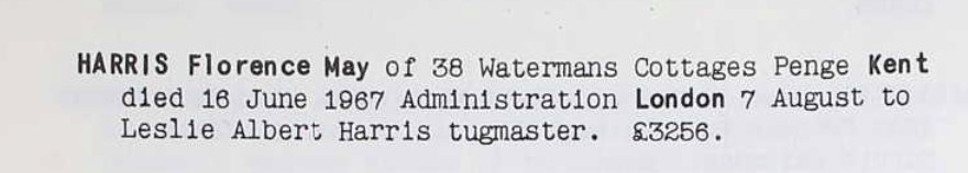 Florence spent all of her life in Kent, England. Throughout her life, she lived in several places around the county: on 103 Milton Road in Margate on Mar 31, 19011 and on Apr 2, 19118; on 124 Byron Road in Margate on Jun 19, 19219; at 6 Randolph Square in Margate on Sep 29, 19392; and at 38 Watermans Cottages, Penge in 1967.