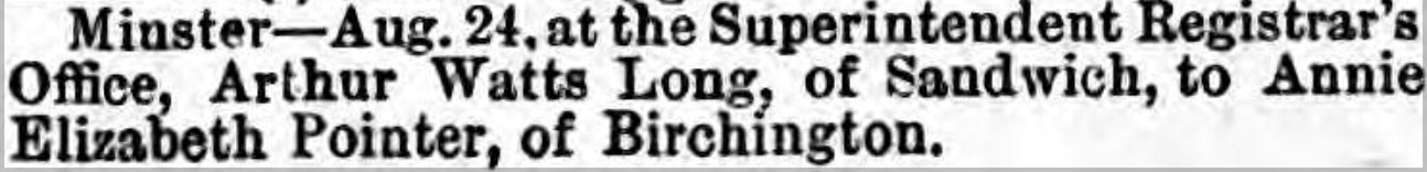 Annie Pointer, the first cousin three-times-removed on the father's side of Nigel Horne, was born in St Peters, Thanet, Kent, England c. 1863 and married Arthur Long (a golf caddy with whom she had 3 children: Eva Gertrude, Mona Winifred Catherine and Arthur Manners Chichester) at Registrar's Office, Minster, Thanet, Kent, England on Aug 24, 18941.