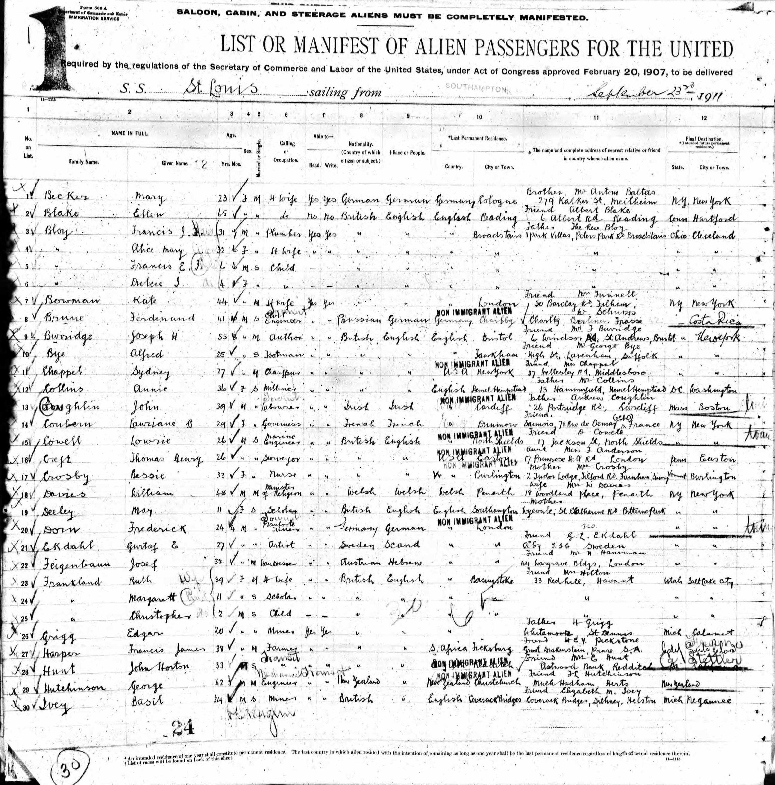 St Louis, American Line, Passenger Manifest
