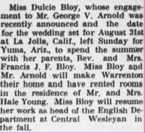 Dulcie Bloy, the second cousin twice-removed on the father's side of Nigel Horne, was born in Birchington, Kent, England on Jun 22, 19071. She married George Arnold in La Jolla, San Diego, California, USA on Sep 7, 1936.