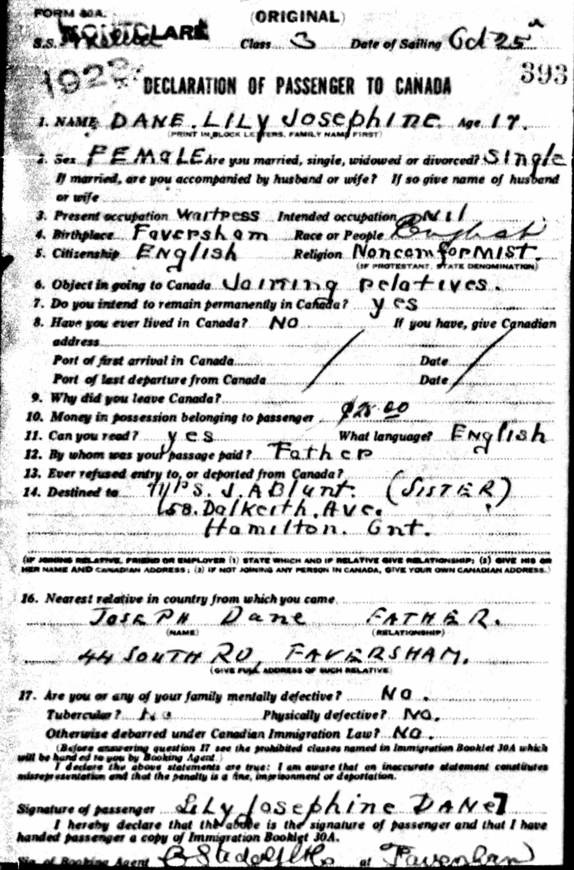 Louisa Dane, the second cousin twice-removed on the mother's side of Nigel Horne, was born in Faversham, Kent, England on Nov 4, 18991,2, was baptized there at St Mary of Charity Church, Church Road on Nov 29, 1899 and also married Adam Blunt (with whom she had 2 children: James A and Daisey, along with 1 surviving child) there, c. May 19183.