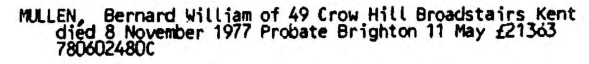 [ Home ] | [ Calendar ] | [ Surnames Index ] | [ Family History ]Bernard Mullen, the husband of Daisy Lillian Dane (the second cousin twice-removed on the mother's side of Nigel Horne), was born in Wolverhampton, Staffordshire, England on Apr 11, 19161,2 and married Daisy (with whom he had 2 children: Bernice and Anthony B, along with 1 surviving child) at Faversham Parish Church, Faversham, Kent, England on Apr 16, 19384. In 1977, he lived at 49 Crow Hill, Broadstairs, Kent.