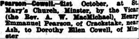 Dorothy Cowell, (also known as Dolly Cowell) the aunt of Nigel Horne, was born in Sutton, Kent, England on Nov 14, 19171,2,3,4,5 and married Henry Pearson (with whom she had 2 children: Helen Anne and Jill, along with 1 surviving child) at St Mary's Church, Minster, Thanet, Kent, England on Oct 21, 19396.