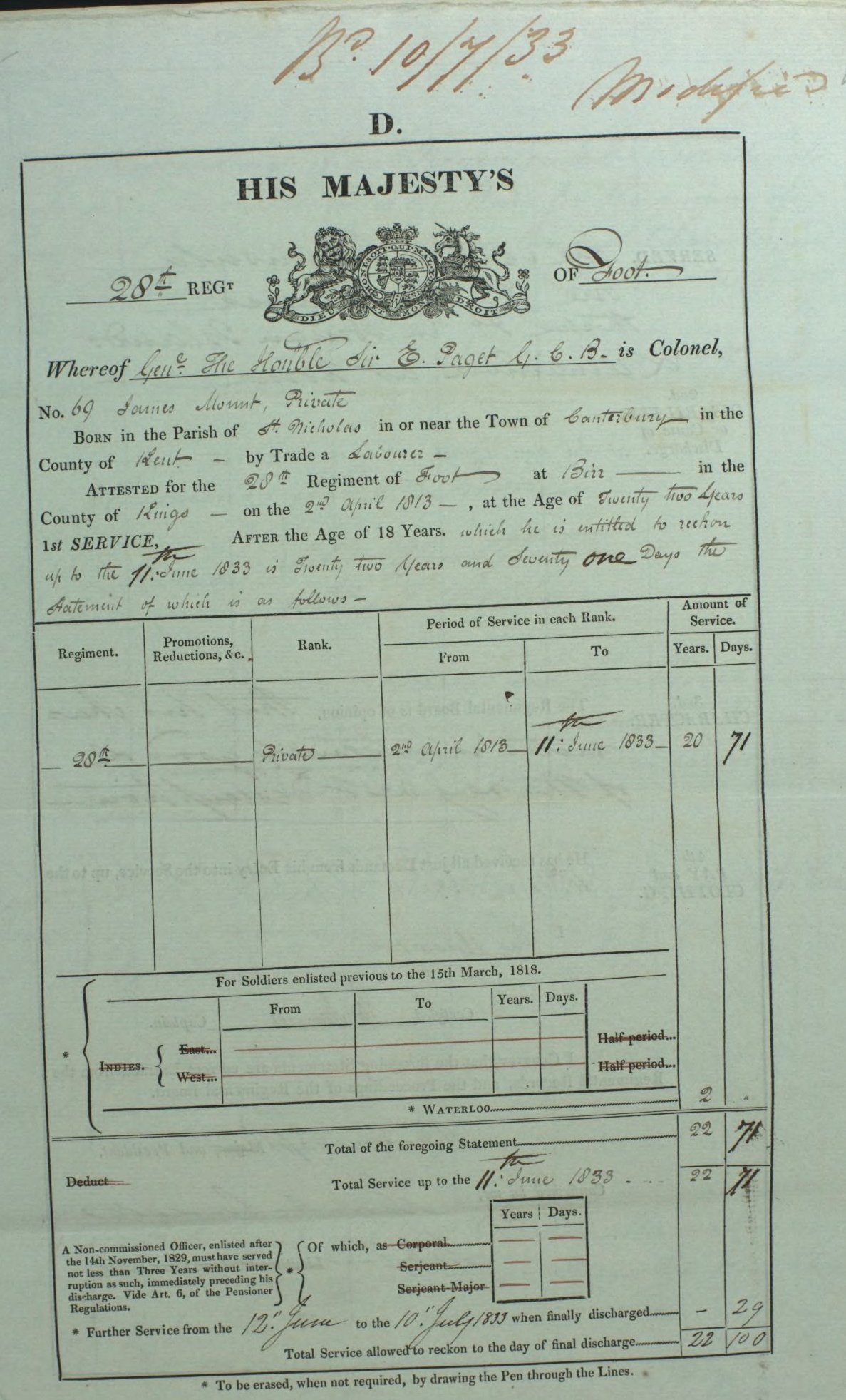 James Mount, the fifth times great-uncle of Nigel Horne, was born in St Nicholas-at-Wade, Kent, England c. 17911 and baptized there on Apr 17, 1791. He was serving in the military from Apr 2, 1813 to Jun 11, 1833 (28th Foot Soldiers, 2nd Battalion).