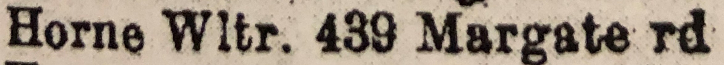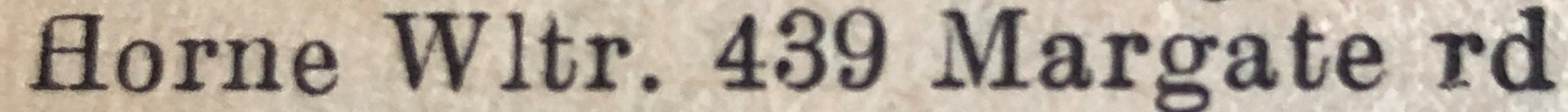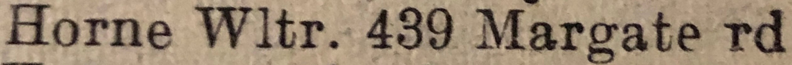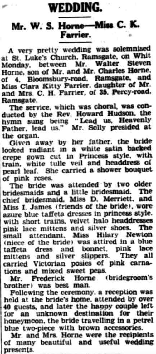 Walter Horne, the second cousin twice-removed on the father's side of Nigel Horne, was born in Ramsgate, Kent, England on Apr 22, 19101,2,3, was baptized in St Lawrence, Thanet, Kent, England on Jun 12, 1912 and married Clara Farrier (a dress maker coathand with whom he had 1 child, Patricia May) on St Luke's Church, Hollicondane Road in Ramsgate on May 29, 19395.