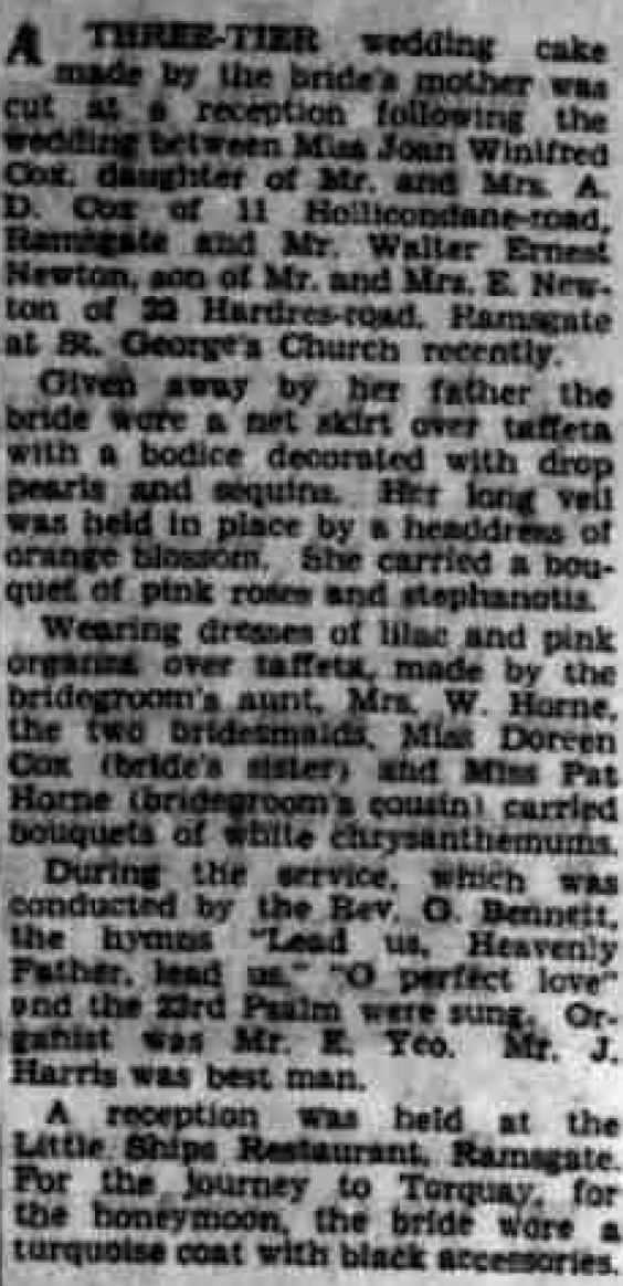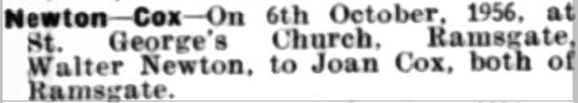 Walter Newton, the third cousin once-removed on the father's side of Nigel Horne, was born in Thanet, Kent, England c. Feb 19311 and married Joan Cox (with whom he had 1 child, Jeffrey W) at St George's Church, Church Hill, Ramsgate, Kent, England on Oct 6, 19562.