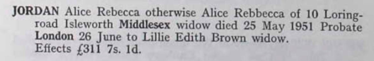 Throughout her life, she lived on 10 Loring Road, Isleworth, London on Jun 19, 19217, on Sep 29, 19391, in 19446 and in 19515.