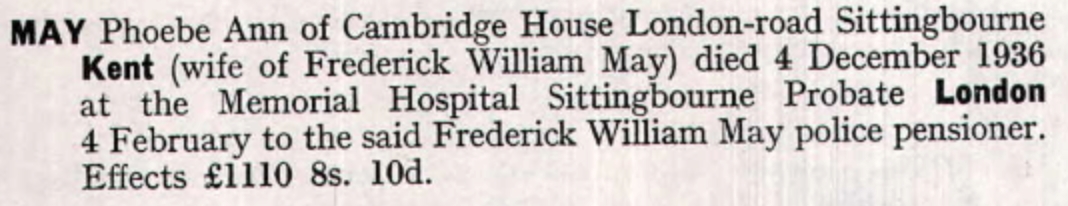 Phoebe Culmer, the first cousin three-times-removed on the mother's side of Nigel Horne, was born in Hernhill, Kent, England c. May 18661,2,3 and baptized there at St Michael on Jun 17, 1866. She married Frederick May (a metropolitan police sergeant) in Bridge, Kent, England around May 18895.