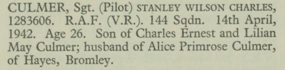 He died on Apr 14, 1942 in Chichester, Sussex, England3,4,5 (www.bromleytimes.co.uk A heroic RAF pilot from Bromley who died in a plane crash in the Second World War will be commemorated in Bognor Regis on Remembrance Sunday, close to the site where his aircraft came down. Sgt Stanley Wilson Charles Culmer, 26, was flying a Handley-Page Hampden AT110 on a mission to attack shipping and the docks at Le Havre on the night of April 14, 1942 - but the plane never reached its destination. Just one hour after taking off from RAF North Luffenham in Rutland, the bomber came down near Bognor Regis, killing Sgt Culmer and three other crew members. As the nation prepares to remember its fallen heroes, RAF Association member David Hewings is hoping to trace relatives of the crew who may be unaware of the airmen's achievements. He told the Bromley Times: "We are hoping that some information will come from any relatives still in Bromley. We would be very pleased to talk to them. We want them to know that these young airmen are remembered and have been for some time."; Little is known about the cause of the accident, although eyewitness reports suggest an engine caught fire. Flying at such a low altitude, the crew would have had no chance to escape. "There is a local newspaper article about the incident," Mr Hewings said. "All it says is there was a conflagration which occurred that night and burned for five or six hours. "They were crossing the coast at 200ft. We have no evidence, but that was the technique at the time to go under the German radar. "Once you get overly the South Downs you are almost at sea level - the ground is low. It makes sense they would come down as soon as they could. "You go down overly the ground so you are not shot out of the air."; Sgt Culmer is commemorated on a memorial plaque close to the point where the aircraft came down, along with Sgt R E Nation, from Canford, Bristol, Sgt J A Hutchison from North Berwick, and Sgt D Manning from Backford, Chester. "Sgt Culmer was the most important one that we want to find information about," Mr Hewings said. "He was the senior man and they probably called him 'uncle'."; Mr Hewings added that the people of Bognor Regis have never forgotten the airmen and the sacrifice they made in defense of the country's freedom. "We think about them every year on remembrance weekend," he said. Anyone with information on Sgt Culmer can send it by post to the RAF Association, Branch 381, Waterloo Square, Bognor Regis, West Sussex BN21 1TE. Envelopes should be marked "Hampden Memorial" and include contact details, including an email address if possible. www.bognorregispost.co.uk PROUD Derek Pallett watched as a memorial to his cousin was unveiled in Felpham. The plaque pays tribute to the sacrifice paid by the four-strong aircrew of a Second World War bomber which crashed 75 years ago close to its site. The memorial is the only one which recalls the death of the airmen who were led by Mr Pallett's cousin and their pilot, newly married Sgt Stanley Culmer, 26. Mr Pallett, 83, of Ormskirk in Lancashire, attended the ceremony last Saturday with his wife, Helen, pictured right. He had never known what happened to his cousin but he does remember being taken to a sweetshop by him to buy chocolate drops. He said: "I feel very proud. It's been quite a while we have been looking for some memorial of my cousin. We looked at several different memorials. "After looking around like we did, this is remarkable. We feel he has been officially remembered now. "I am surprised and delighted at the turnout here today."; About 150 people attended the ceremony of some 20 minutes held in Sea Road. Exactly 75 years earlier, and the No 144 Squadron twin-engined Handley-Page Hampden AT110 – based at RAF North Luffenham in Rutland – was on a Bomber Command mission to attack shipping and the docks at Le Havre in France. No-one knows what went wrong an hour or so after the aircraft took off at night but a possible engine fire caused it to crash in flames just 100 yards short of the English Channel. The other crew members were Sgt RE Nation, 21; Sgt JA Hutchison, 25; and Sgt D Manning, 21. An original memorial to the crash, installed about five years ago, still remains attached to the boundary wall of Butlin's. But the replacement is larger and more prominent. It cost some £1,200 and its installation was led by the Bognor Regis branch of the Royal Air Forces Association. Branch secretary David Hewings said: "David Pallett's recollections of the very brief time he had with his cousin have added an awful lot of meaning to this service. It is the first time we have had a known relative of the aircrew with us."; The Rev John Challis read out the names of the aircrew before a short reading from Psalm 21. He said: "Seventy-five years ago, seems a very long time ago – and I was only a few months old when the Hampden bomber crashed near here – but the courage and dedication to duty of these four young crewmen should still be remembered all these years later."; Cadets Gregory Cocks, 15, and Emily Sherrington, 12, of the 2351 Sqn Air Training Corps in Bognor Regis provided a guard of honor to the memorial and performed the unveiling of the Union flag. Cdt Cocks said: "It's really important we remember the aircrew and preserve the heritage that we have. By remembering these specific people, we remember all those who have given their lives."; RAFA branch president Ron Flatt laid a red, white and blue wreath on the memorial during the service. runs for a month for charity) and was buried at St John The Baptist Churchyard, West Wickham, Kent, England after Apr 14, 1942.