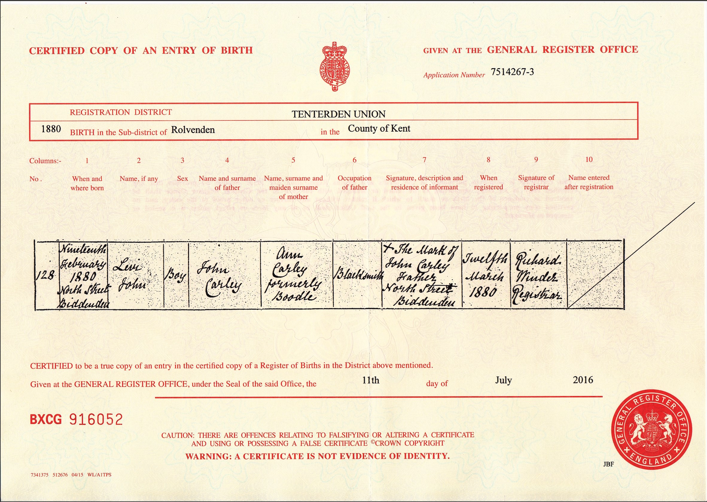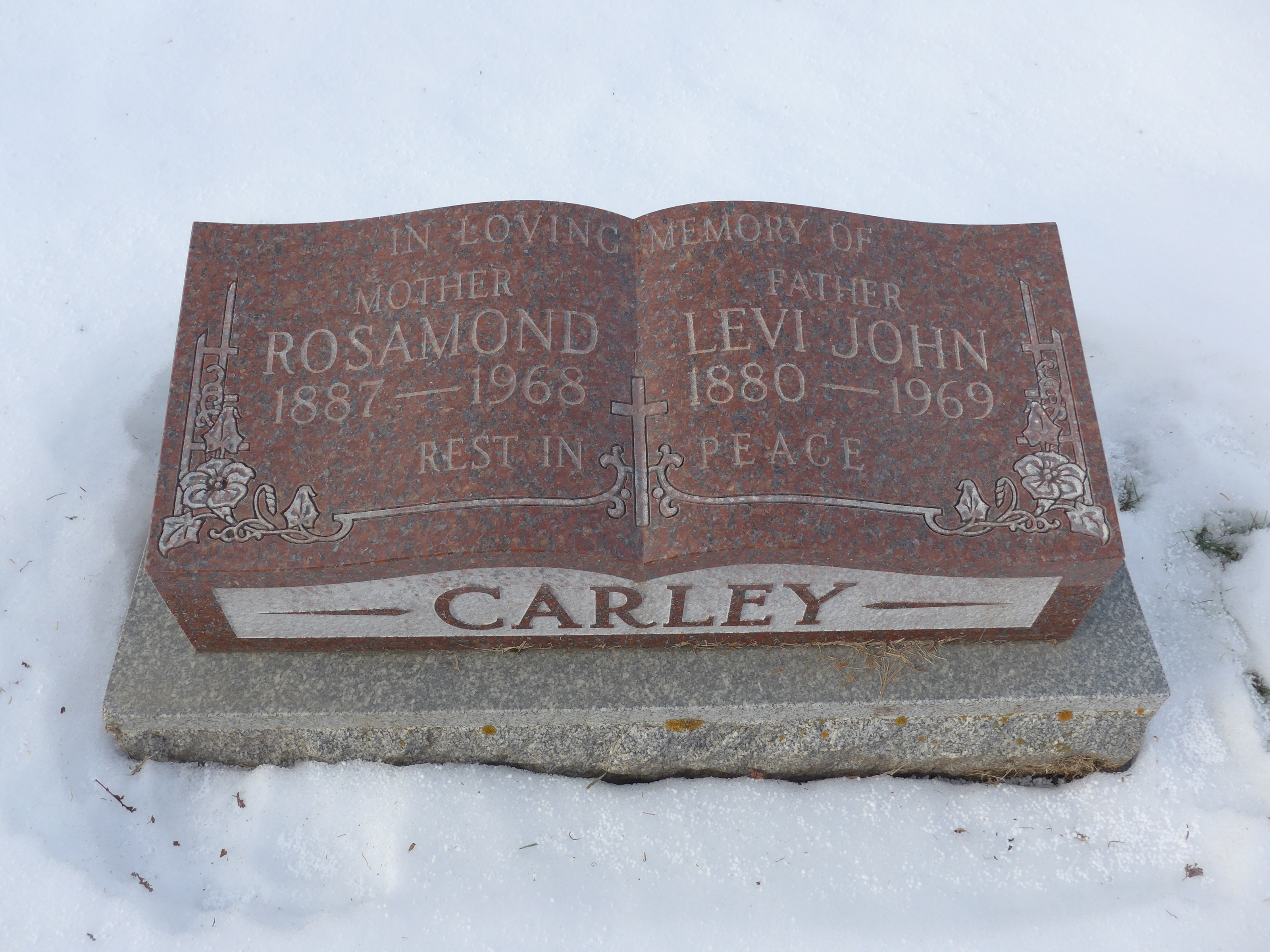 Levi Carley, the second cousin twice-removed on the mother's side of Nigel Horne, was born in Biddenden, Kent, England on Feb 19, 18801,2, was baptized in Wye, Kent, England on Aug 29, 1880 and married Rosamund Flaxman (with whom he had 10 children: Daphne, Gwen, Phyllis, Leslie John, Hilda Dorothy, John William, Gordon Percy, Muriel, Harold and Richard, along with 4 surviving children) in Calgary, Alberta, Canada on Oct 25, 1909. On Apr 3, 1881, he lived at Church Farm Cottage, Harty, Kent, England1. He arrived in Canada in 1900.