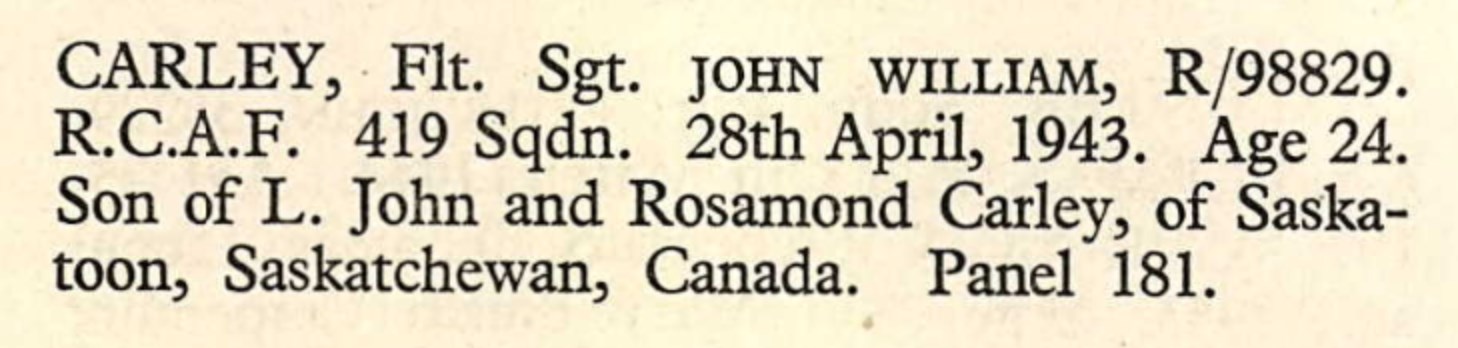 John Carley, (also known as Jack Carley) the third cousin once-removed on the mother's side of Nigel Horne, was born in Keppel, Saskatchewan, Canada on Nov 13, 1918. He went to Westmount School, Saskatoon, Saskatchewan, Canada In 1943 he was serving in the military (regiment: Royal Canadian Air Force; Rank: Flight Sergeant; Service number: R/98829 419 Sqdn).